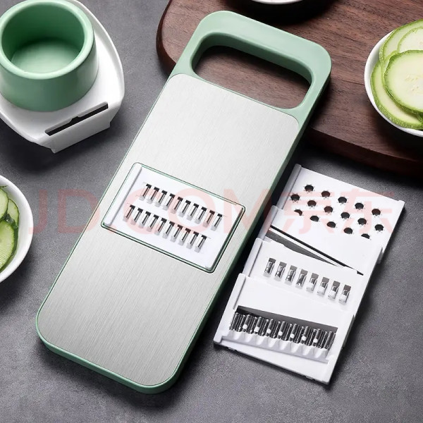 #双旦必备厨房神器 这款多功能擦菜器高颜值,不锈钢面板相比一般塑料面板更耐磨;加宽护手器,切菜再也不怕“见红了,”有五种刀片,粗、细、磨功能随意切换,轻松切出花样且操作便捷,容易清洗。对于我这样做饭小白,无刀功基础的生手完全是可以上手的。我最怕切菜,小时候经常切菜时被刀切过食指,尤其是类似于土豆丝这样的,每次都小心翼翼的但是还是避免不了被切,一顿饭下来光切菜就花了不少时间。有了这款多功能切丝神器,我不仅可以切出薄片还可以切出面条般的丝,分分钟钟搞定做饭!#家庭烹饪必备品 #美食制作小帮手