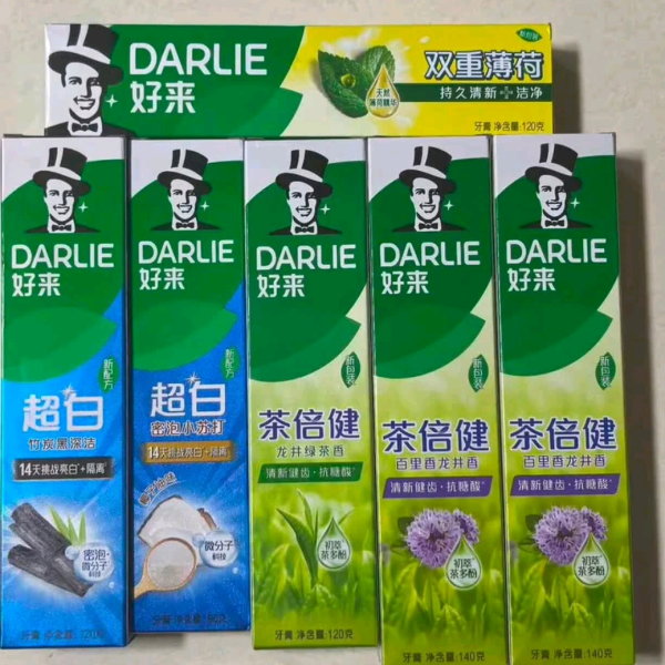 DARLIE 好来 牙膏套装 (超白竹炭深洁120g*2+冷压椰子油超白密泡小苏打190g+超白亮白隔离190g+茶倍健龙井绿茶120g)