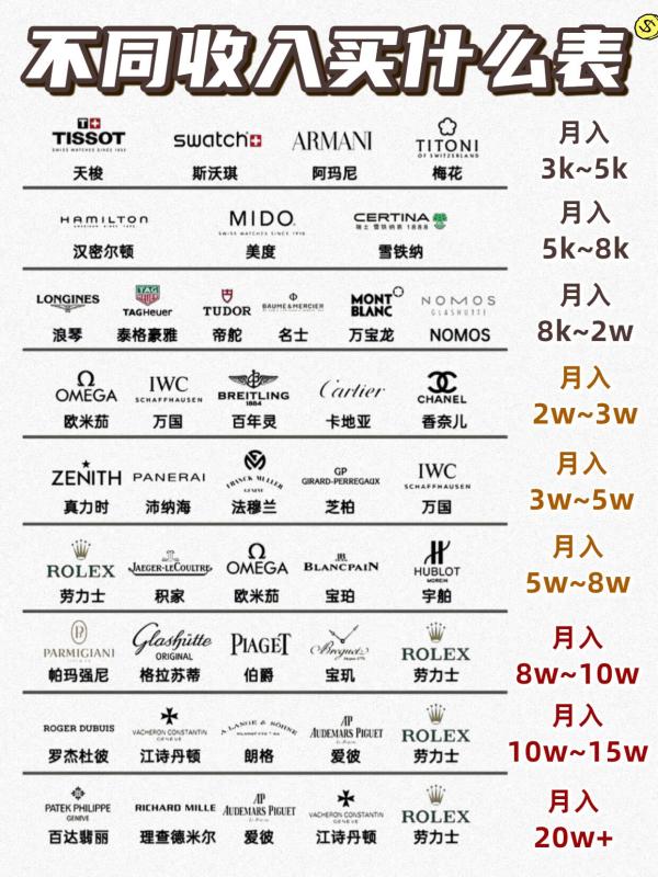 刚入坑手表的宝子是不是总纠结?月薪多少该买什么表?怕买贵了超支,买便宜了没面子? 这份按月薪划分的买表清单直接给你安排明白!从入门到顶奢,每一档都给你选好了口碑款,不踩坑、不盲目,选适合自己的,才是最高级的体面👇 ✨ 月入3k-5k:入门首选,性价比拉满 刚工作的宝子不用硬冲大牌,选颜值在线、质量靠谱的入门款就够了。 - 天梭:瑞士入门级标杆,经典力洛克系列闭眼入,通勤百搭,学生党也无压力- 斯沃琪:设计年轻有活力,颜值高价格亲民,适合追求个性的年轻人- 阿玛尼:时尚感拉满,设计简约大气,日常穿搭好搭配,职场新人也能hold住- 梅花:老牌瑞士表,做工扎实耐用,低调不张扬,长辈也认可的口碑款 ✨ 月入5k-8k:进阶之选,质感升级 预算上来一点,就能选到更有质感的瑞士机械表,通勤戴体面感直接拉满。 - 汉密尔顿:美式复古风拉满,军表风格硬朗,电影《星际穿越》同款,机械表性价比之王- 美度:以精准走时和简约设计著称,贝伦赛丽系列经典耐看,适合职场通勤- 雪铁纳:瑞士亲民机械表,防水性能强,耐用抗造,日常戴完全不心疼 ✨ 月入8k-2w:轻奢主力,体面之选 这个预算是职场人的黄金区间,既能买到知名大牌,又不会有太大经济压力,社交场合完全拿得出手。 - 浪琴:国民级轻奢表,名匠系列经典永不过时,商务休闲都能搭,认可度拉满- 泰格豪雅:运动风腕表代表,计时码表专业度高,适合喜欢运动、追求个性的男生- 帝舵:劳力士同门小弟,做工扎实耐用,风格硬朗,性价比超高- 名士:法式优雅风,设计简约高级,适合气质型职场人- 万宝龙:品牌调性高级,设计简约大气,商务场合戴气场十足- NOMOS:德系极简风,包豪斯设计,颜值超高,适合喜欢小众高级感的宝子 ✨ 月入2w-3w:豪华入门,气场全开 这个档位已经是豪华腕表的入门级,每一款都是硬通货,辨识度和档次感直接拉满。 - 欧米茄:海马、超霸系列经典款,品牌知名度高,商务运动都能驾驭,保值率在线- 万国:葡计、柏涛菲诺系列,商务风拉满,职场精英标配,气场十足- 百年灵:专业航空、潜水腕表,硬朗帅气,适合喜欢户外、追求个性的玩家- 卡地亚:蓝气球、坦克系列,时尚与奢华并存,男女通吃,社交圈认可度超高- 香奈儿:J12系列,陶瓷表身高级感拉满,时尚圈顶流,女生戴超有气质 ✨ 月入3w-5w:高端之选,品味之选 预算到这个档位,选的就不只是手表,更是个人品味和身份的象征。 - 真力时:瑞士高端制表品牌,自产机芯技术过硬,性价比在同价位里很能打- 沛纳海:大表径设计,硬汉风格拉满,辨识度超高,适合喜欢个性的玩家- 法穆兰:酒桶型表身+数字刻度,设计感十足,时尚圈宠儿- 芝柏:历史悠久的顶级制表品牌,三金桥陀飞轮是招牌,工艺精湛- 万国:高端款型可选,比如葡萄牙系列复杂款,商务感拉满 ✨ 月入5w-8w:奢华顶流,硬通货级别 这个档位已经是腕表界的第一梯队,每一款都是保值硬通货,社交场合的身份名片。 - 劳力士:水鬼、日志系列,硬通货中的硬通货,保值率拉满,闭眼入不亏- 积家:顶级制表品牌,月相大师系列经典,工艺精湛,低调奢华- 欧米茄:高端复杂款可选,比如超霸月球表,收藏价值拉满- 宝珀:顶级制表品牌,五十噚系列潜水表鼻祖,专业度拉满- 宇舶:大爆炸系列,设计前卫奢华,适合追求个性的高端玩家 ✨ 月入8w-10w:顶级奢华,工艺之巅 预算到这里,选的就是顶级制表工艺和品牌历史,每一款都是艺术品。 - 帕玛强尼:小众顶级品牌,设计独特,工艺精湛,适合追求小众高级感的玩家- 格拉苏蒂:德系顶级制表,偏心月相系列经典,德式严谨工艺拉满- 伯爵:珠宝腕表专家,设计奢华精致,适合喜欢珠宝感的宝子- 宝玑:历史最悠久的制表品牌之一,陀飞轮发明者,工艺传承拉满- 劳力士:迪通拿、格林尼治等热门款,收藏价值拉满 ✨ 月入10w-15w:富豪之选,顶级硬货 这个档位已经是富豪玩家的专属,每一款都是限量款、复杂款,身份的象征。 - 罗杰杜彼:圆桌骑士系列,设计夸张奢华,顶级制表工艺- 江诗丹顿:顶级制表品牌,纵横四海系列,奢华与实用并存- 朗格:德系顶级制表,工艺极致,低调奢华- 爱彼:皇家橡树系列,奢华运动表鼻祖,硬通货中的顶流- 劳力士:稀有款、古董款,收藏价值拉满 ✨ 月入20w+:顶奢天花板,收藏级 这个档位已经是腕表界的天花板,每一款都是收藏级珍品,有钱也不一定能买到。 - 百达翡丽:表王之王,鹦鹉螺系列,腕表界的天花板,身份的终极象征- 理查德米勒:亿万富翁的入场券,设计前卫,材质顶级,价格不菲- 爱彼:皇家橡树离岸型高端款,奢华运动表代表- 江诗丹顿:传家系列,工艺极致,适合收藏传承- 劳力士:古董款、稀有限量款,收藏价值拉满 买表从来不是越贵越好,而是适合自己的才最好。根据自己的收入理性消费,不攀比、不超支,戴出自己的风格,就是最体面的事。 你们现在戴的是什么表?下一块想入哪一款?评论区聊聊呀~ #手表 #奢侈品手表 #买表指南 #劳力士 #欧米茄 #浪琴 #百达翡丽 #腕表 #奢侈品 #手表推荐#这货真值