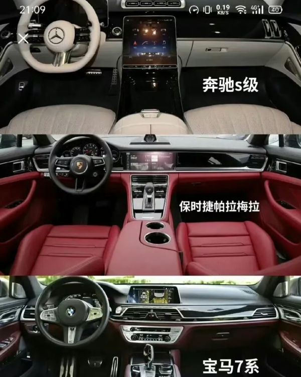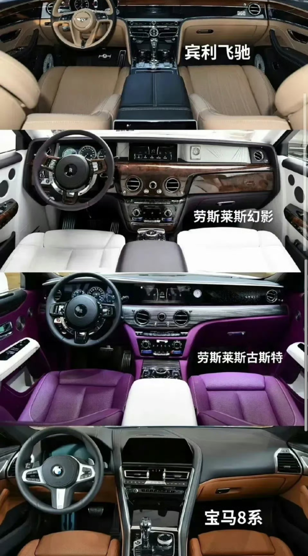 豪车内饰系列,劳斯莱斯的内饰太出众。国产红旗L5,过于复古了一点,不过考虑坐红旗L5的人群这也很正常。奔驰不愧是做内饰出身的,豪华时尚程度必须被拉满。
