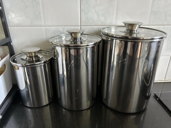 Amazon Basics之前买过一个显示器升降架,和爱格升是同一代工厂生产的,几乎一模一样。这次买了三件套Amazon Basics的不锈钢厨房密封罐,质量也非常不错,304不锈钢材质,三个罐子不同尺寸,盖子是透明的,方便观察,买来用来存放五谷杂粮之类的食品很合适,密封性很好,不容易霉变,就是尺寸比我想象中大一些,没法放在冰箱里。Amazon Basics大概相当于我们这里的京东京造,性价比非常高。