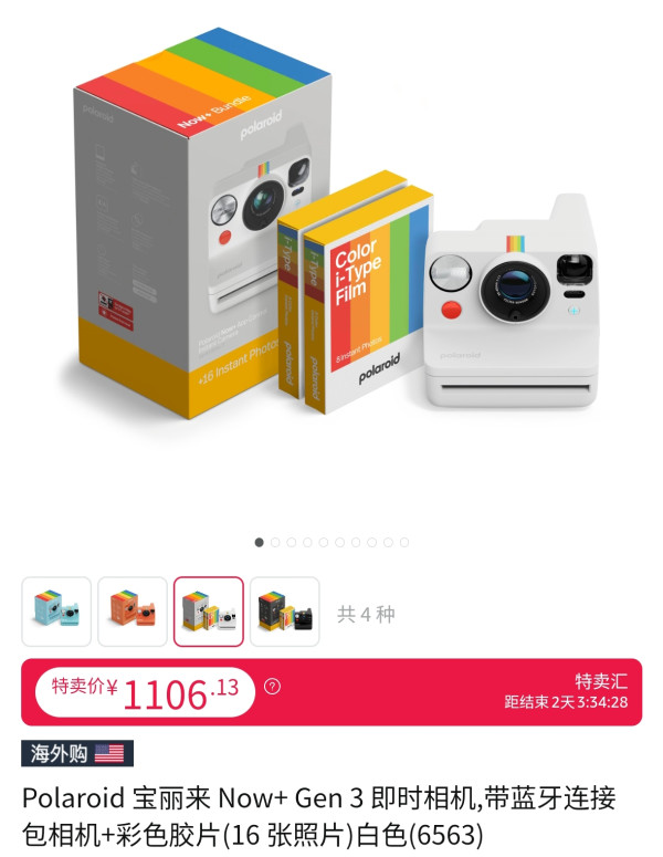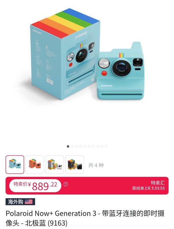 绝美极地蓝宝利来now+3代拍立得来了!谁说复古与智能不能兼得?宝丽来Now+第3代(Gen 3)即时相机,身披绝美的“北极蓝”战衣,震撼登场!它完美继承了宝丽来标志性的复古格调,方正机身、醒目快门键,顶部一抹彩虹装饰,瞬间点亮你的创作灵感。这抹来自极地的清新蓝色,本身就是一件吸睛的时尚单品。但它的魅力远不止于颜值!Now+ Gen 3是经典的模拟相机,却搭载了蓝牙智能芯。只需轻松连接专属Polaroid应用程序,就能解锁前所未有的创意潜能:* 化身为光影魔术师: 光圈优先模式、手动模式让你精准掌控曝光。* 创作无限可能: 双重曝光、光绘艺术,释放天马行空的想象。* 解放双手自拍王: 遥控快门功能,独处也能定格完美瞬间。更重要的是,Gen 3代内在全面进化!优化的双镜头自动对焦系统配合升级的距离传感器,带来更清晰的成像。曝光指示位置更合理,操作更直观。底部集成了实用的三脚架支架,并兼容创意照片滤镜,让你的稳定创作如虎添翼。贴心、环保,为热爱续航: 机身采用40%再生环保材料,践行可持续理念;USB-C接口可充电电池,告别一次性电池的浪费。它兼容宝丽来i-Type和经典600胶片,全画幅呈现那份无可替代的即时成像魅力与等待显影的惊喜仪式感(保护膜需另购)。绝美北极蓝,限时特惠! 现在通过海外购平台,即可入手这款集复古美学与智能创新于一身的Now+ Gen 3。除了北极蓝,还有多种个性色彩可选。限时特卖价 ¥889.22!机会转瞬即逝