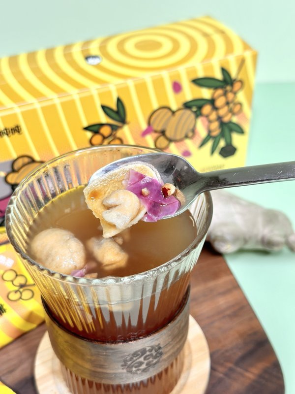 非常幸运能品尝冻干果茶开创品牌:水獭吨吨桂圆姜姜冻干果饮。这款冻干果茶通过桂圆果肉鲜萃冻干4.0技术,以黑糖、结晶果糖、罗汉果汁为代糖,添加桂圆、姜青汁浓缩汁、生姜片、生姜粉、重瓣红玫瑰花酱的纯天然配方,让忙碌的打工人可以随时随地实现一杯水现做鲜果茶的方便。这盒桂圆姜姜冻干果饮一盒有6包,一包净含量12克,加入200毫升开水就可以喝了。打开包装,就能闻到玫瑰花和姜、黑糖的味道,加入开水后,冻干食品迅速散开,只有桂圆浮在表面,随着冻干品的散开,越来越浓郁的闻到果茶中姜和玫瑰花、黑糖的味道,当桂圆变软的时候,搅拌均匀,这时候的口感应该是最好喝的。喝一口果茶,味道淡淡的甜味,醇厚甜润,玫瑰花香和黑糖的香味浓郁,之后之后就是姜的辣,这种辣感会持续在口中,我还有点不适应呀。如果你手脚冰凉,或是熬夜之后、在经期可以尝试这款纯天然的桂圆浆浆冻干果饮,温暖你的全身。