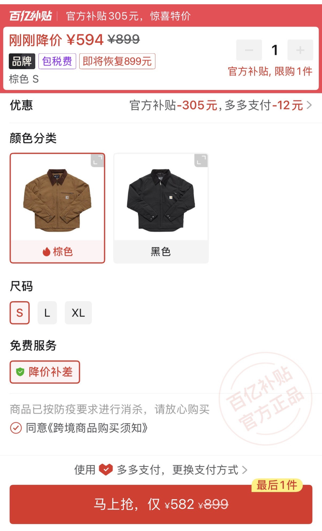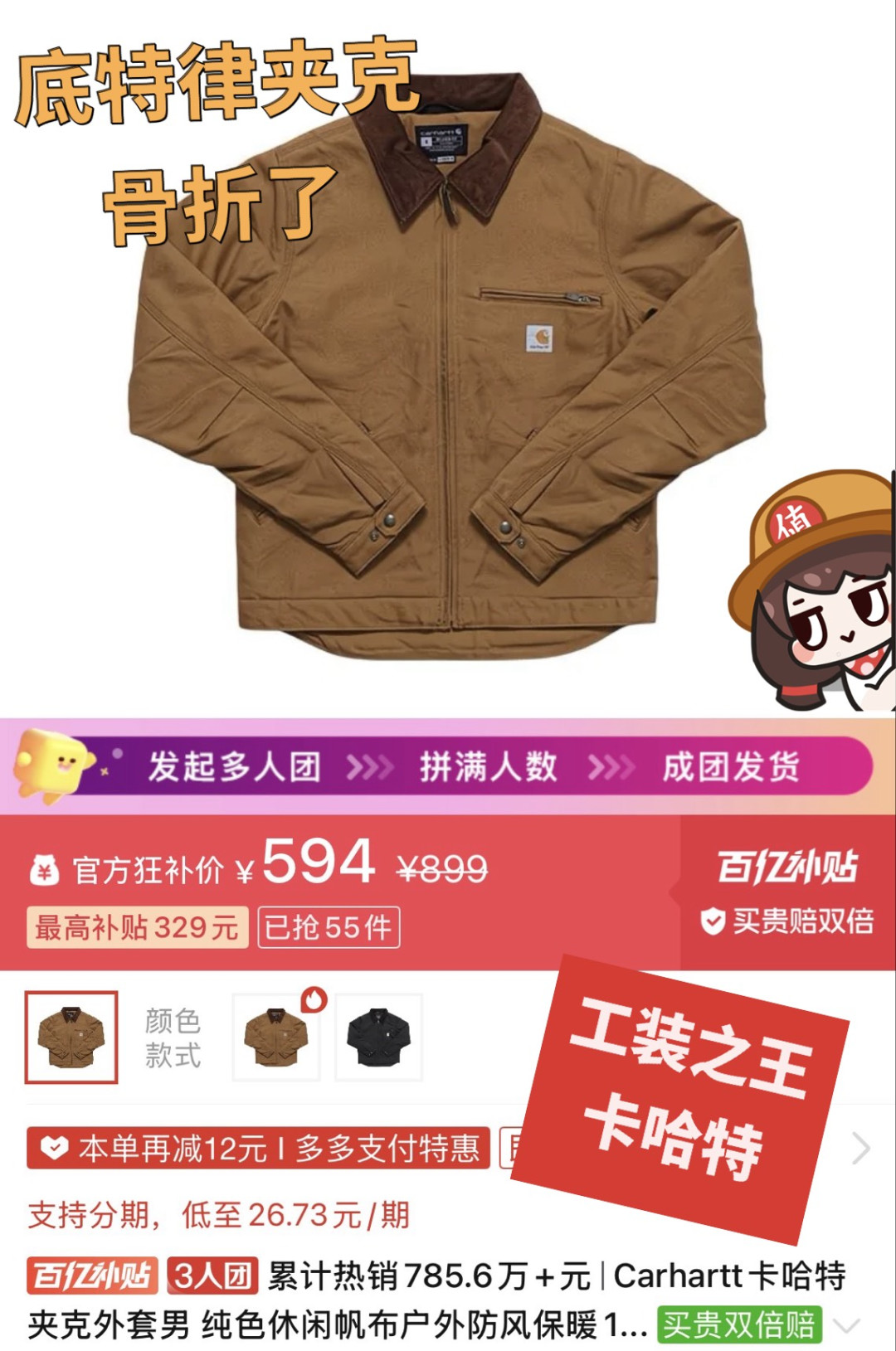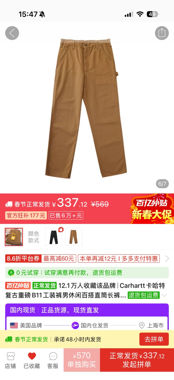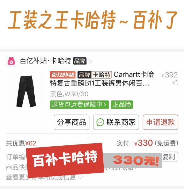 最近PDD百补上强度了,卡哈特估计卖不掉啊,都年初五了还再卖…根本清不完库存😂本来390多,我是不想买的。怎料 今天拿了个初五财神券,再叠加砸金蛋,最后用工行卡-10元,最终330元含泪🥹下单!PS:这个价格已经比自己海淘便宜了,海淘差不多50几美元,加运费不会便宜,这种重磅裤子运费很贵(起码60➕)。2️⃣关于Carhartt b11工装裤B11相比网红双膝裤区别还是挺大的,整体重量轻很多,去掉了膝盖双层拼接,变为单膝裤;相比更适合日常穿搭,然后金属铆钉也没了,改为普通缝线,相对低调一些。双膝裤其实是为了需要跪姿作业的工人设计的,并不是太适合日常穿搭,所以我其实更推荐更轻更舒适的B11单膝裤。最后,就看到手情况,再晒图反馈给大家!#卡哈特复古经典 #男装休闲必备款 #硬核选购指南