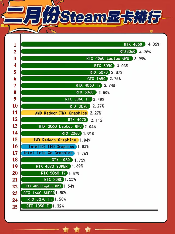 之前网上吵得沸沸扬扬,说这卡位宽被阉割、性价比不高,结果数据一出来,大家还是老老实实掏了腰包。这大概就是:嘴上说不要,身体很诚实。为什么4060成了“香饽饽”?主流的天花板: 4.36%的份额直接登顶,正式终结了3060的时代。对于咱们普通玩家来说,追求的不是什么顶级跑分,而是在1080P下能稳跑各种大作。50系开始抢滩: 虽然40系正红,但 RTX 5070 已经杀进了前五(2.87%),增速快得惊人。这说明高端玩家的换代需求非常猛,新显卡的吸引力不容小觑。老兵的余晖: 挺感慨的,看到 GTX 1060 还没掉出前二十,虽然排名一直在滑,但它就像个“精神图腾”,见证了多少人的游戏青春。你现在的显卡还能打吗?是打算再战三年,还是已经在看50系的路上了?欢迎在评论区聊聊你的看法。