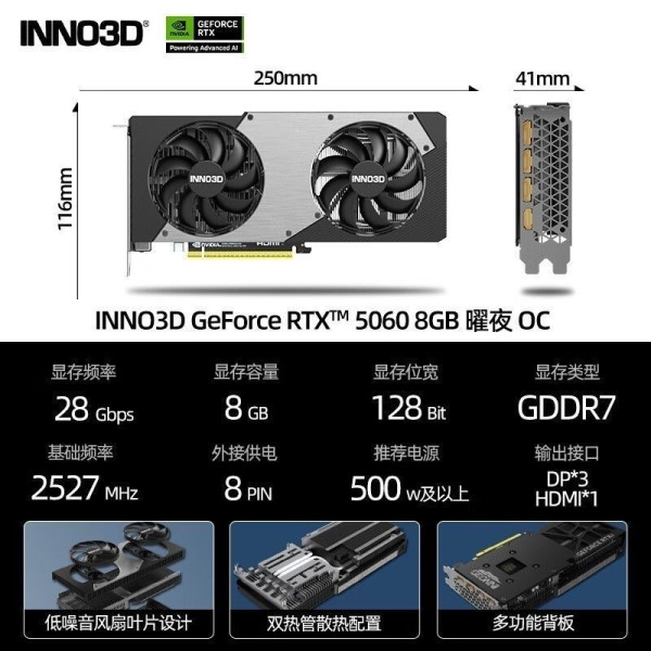 映众(Inno3D) RTX5060Ti 曜夜 8G/16G 全新架构DLSS 4 甜品电竞游戏台式电脑独立显卡 RTX5060Ti 曜夜 X2 8G