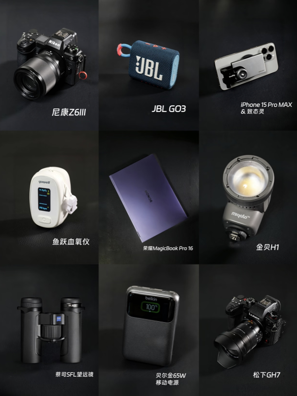 国庆快到了,有没有远离喧嚣的城市投入大自然群山的怀抱中的想法。出发前精心为大家筛选了一批装备,剔除了无用款,最终留下这些趁手工具,分享给同样计划去高海拔地区拍摄的朋友。 一、核心拍摄设备 - iPhone 15 Pro MAX + 致态灵先锋版移动固态硬盘:手机是随手拍的利器,但我的手机已使用1年,内存告急。而且拍摄4K60P ProRes视频必须外接PSSD,这款移动硬盘刚好解决存储难题,让我随时能记录沿途风景。- 尼康Z6III:作为首款搭载部分堆栈式CMOS传感器的尼康Z6系列机型,它抓拍速度快且精准,无论是动态的美景还是灵动的小动物,都能清晰定格。此次搭配了Z 50mm F1.4和Z 600mm F6.3 VR S镜头,满足不同场景拍摄需求。- 松下GH7:有ARRI色彩科学加持,作为M43无反相机,它拍视频的效果格外出色,高海拔地区的壮丽风光经它记录,色彩和质感都让人惊喜。 二、辅助拍摄工具 - 金贝H1:集高速同步闪光和12W常亮灯功能于一身,无论是静态摄影补光,还是视频拍摄打光,一个灯就能轻松应对,省去携带多件补光设备的麻烦。- 蔡司SFL双筒望远镜:高海拔地区视野开阔但部分景物距离较远,这款望远镜成像清晰、色彩还原度高,能帮我远距离观察高原鸟兽,还能将远处的雪峰“拉近”,方便我提前构思拍摄画面。 三、保障与休闲设备 - 荣耀MagicBook Pro 16:搭载Intel Core i5 125H处理器和NVIDIA RTX 4060显卡,白天拍摄结束后,我能用它快速处理照片、剪辑视频。闲暇时还能玩一把《黑神话:悟空》,缓解一天的疲惫。- 贝尔金65W移动电源:高海拔地区充电不便,且携带的电子设备较多,这款移动电源有双C接口和一个A口,不仅能充手机、相机,还能带动笔记本电脑,彻底解决我的电量焦虑。- 鱼跃血氧仪:高海拔地区易出现高原反应,虽然喝红景天预防高反的效果不明确,但血氧仪能实时监控血氧浓度和脉搏。一旦发现身体数据异常,我就能及时前往低海拔地区,保障自身安全。- JBL GO3:在高海拔地区旅行,很多时间都花费在路上。这款音箱尺寸紧凑,不占行李空间,声音效果比手机出色,路上放首歌,能让漫长的行程更轻松。这些装备从拍摄、辅助到安全保障全方位覆盖,让我的高海拔拍摄之旅既高效又安心,如果你也有类似计划,不妨参考这份清单准备装备。