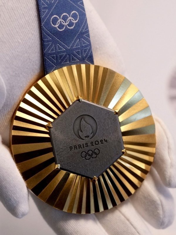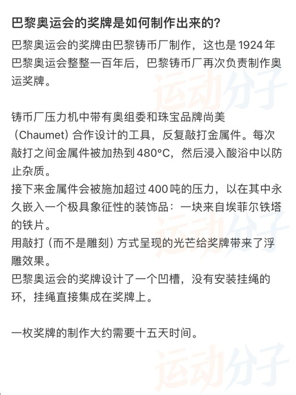 巴黎奥运会的奖牌由巴黎铸币厂制作,这也是1924年巴黎奥运会整整一百年后,巴黎铸币厂再次负责制作奥运奖牌。铸币厂压力机中带有奥组委和珠宝品牌尚美(Chaumet)合作设计的工具,反复敲打金属件。每次敲打之间金属件被加热到480℃,然后浸入酸浴中以防止杂质。接下来金属件会被施加超过400吨的压力,以在其中永久嵌入一个极具象征性的装饰品:一块来自埃菲尔铁塔的铁片。用敲打(而不是雕刻)方式呈现的光芒给奖牌带来了浮雕效果。巴黎奥运会的奖牌设计了一个凹槽,没有安装挂绳的环,挂绳直接集成在奖牌上。一枚奖牌的制作大约需要十五天时间。