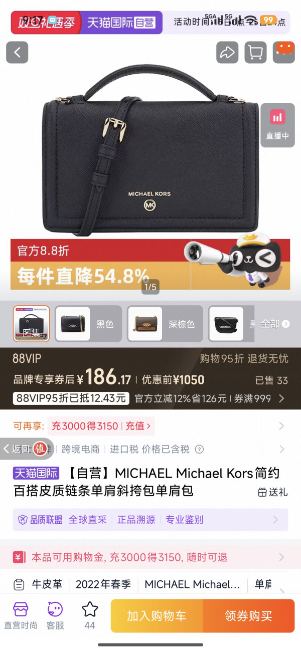爆料时偶然发现一款MICHAEL KORS真皮单肩包只要200多。我有50红包,可以186买下。天猫国际自营应该正品吧,这么便宜可能因为是几年前的老款库存,也可能有瑕疵?到手后仔细检查,没有发现瑕疵,品相完美。款式是老一些,不过也算经典。尺码略小,正好放一个手机。这款库存很少,不定时上架一两件,需要的得多留心。