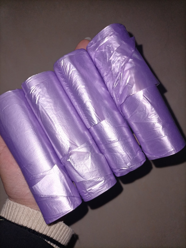 垃圾袋虽然很薄,但是胜在价格便宜,之前搞活动的时候,一块钱就能买到5卷(有一卷我快用完了就不拍出来了),一次套两只来用也不心疼。垃圾袋是连卷背心点断式的,可以手提的那种,底是八角底,更贴合垃圾桶🗑️
