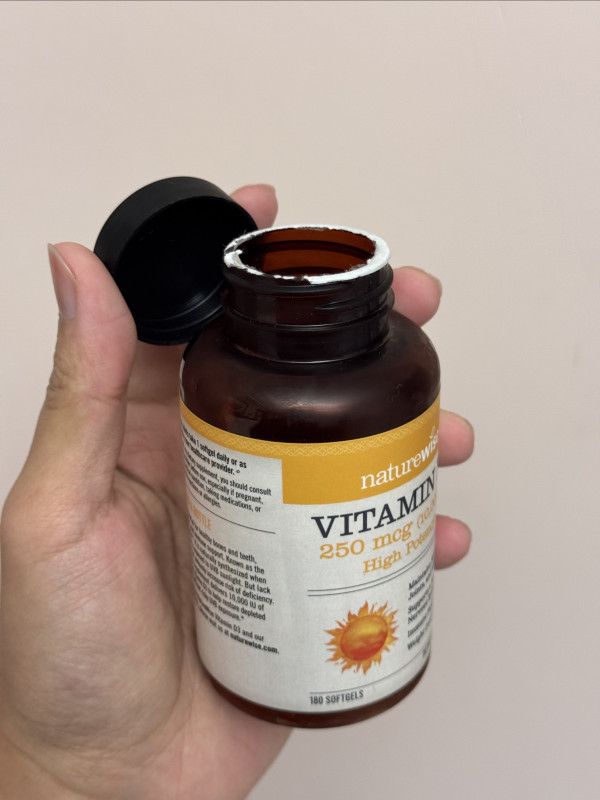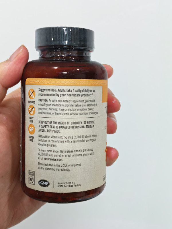 #达人激励计划 冬天就要来了,成都的阳光特别少,作为久坐办公室、常年和阳光“躲猫猫”的打工人,必须补充点VD,于是买了这个NatureWise维生素D3软胶囊!每粒含250mcg(10,000IU)高 potency 维生素D3,小小一粒就像把阳光装进胶囊里~配料表很干净,有机初榨橄榄油助力吸收,胶囊壳由明胶、甘油等天然成分制成,还不含小麦、麸质、乳制品等易致敏物质,对敏感肌也友好。一瓶180粒,足够我慢慢补充能量。坚持吃了一段时间,明显感觉关节僵硬感减轻,免疫力也悄悄up,连之前换季容易犯的小感冒都绕着走~ 对于和我一样常年宅家、日晒不足的朋友,这款维生素D3简直是刚需补剂,把“阳光活力”揣进兜里,随时给身体充能~