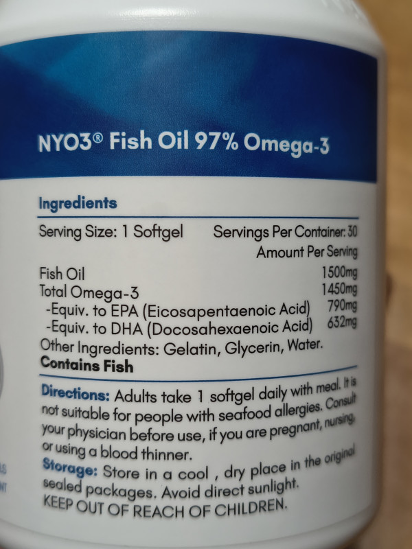 #鱼油品牌大比拼 #如何挑选优质鱼油 #高含量鱼油怎么选 人到中年,保护好自己的心脑血管是必须的,补充一下鱼油也是必要的,但是如果是低含量的鱼油,那还不如不吃。购买的这款nyo3鱼油就是含量非常高的那种。每颗含epa790mg,含dha632mg。而且是属于rtg型的,这个也是非常重要的,rtg属于人体易吸收的类型,不然含量再高,不能吸收也是白搭。目前市场上鱼油品牌龙蛇混杂,数百个品牌在一起,挑的眼花缭乱的感觉。一定要注意看配方表,识别出真正有效的产品。#创作者激励计划 #鱼油市场乱象揭秘