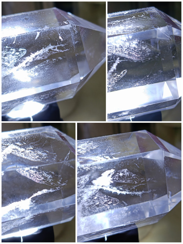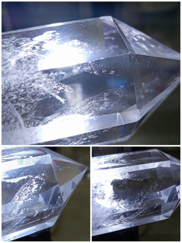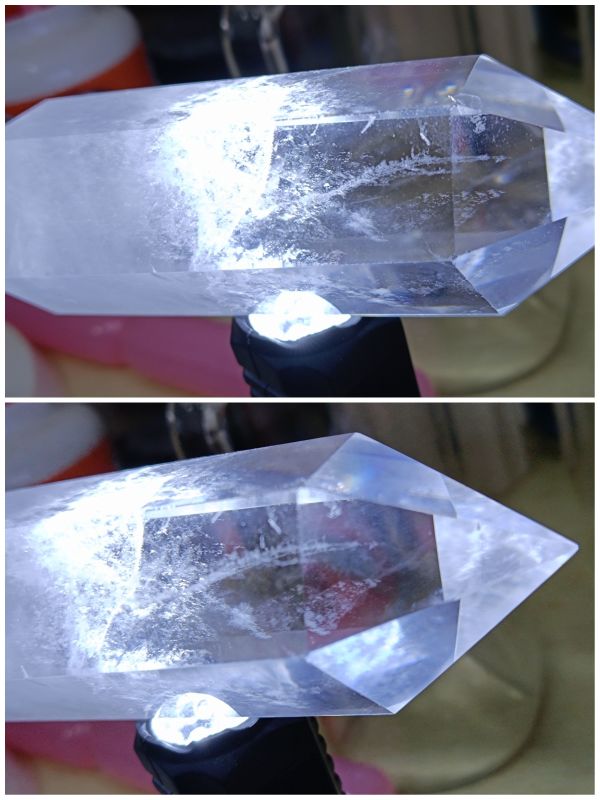 #达人激励计划 这些水晶柱,有着较为规整的几何外形,多呈现六棱柱体搭配尖顶的形态 。晶体透明度不错,澄澈的质感能让人窥见内部世界。 内部有着天然形成的絮状、云雾状包裹体,像是大自然悄悄藏进水晶里的 “小秘密”,它们分布形态各异,为每一根水晶柱增添了独一无二的纹理。在光线映照下,水晶柱折射出清亮光泽,包裹体的影子也被衬得更为明显,似朦胧的雪、轻柔的云,给硬朗的晶体添了份柔和。 水晶柱的棱面清晰,切割打磨后的规整度,展现出工艺与天然形态的融合,既保留了矿物的原始韵味,又因人工修饰凸显出精致感,静静摆放时,仿佛是时光与地质运动共同雕琢出的 “透明宝藏”,每一处细节都在诉说漫长岁月里的形成故事,吸引着人们去探寻水晶世界的奇妙。#水晶柱的神秘之美 #桌面上的晶莹世界 #双重视角下的水晶 #微观下的自然奇迹