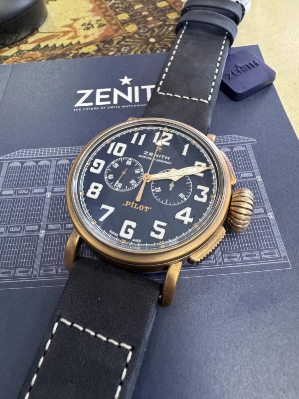 #我的双11战绩,开箱! 双十一最让我惊喜的时尚单品,是真力时飞行员系列青铜大飞腕表。45毫米的霸气表盘戴在手腕上并不显笨重,反而因纤细表耳设计贴合手腕,硬朗中透出精致感。卡其绿表盘与白色凸起阿拉伯数字时标的搭配,复刻了经典飞行员仪表的清晰布局,镀金琢面指针在光线变换下折射出细腻光泽,复古气息扑面而来。作为日常搭配的点睛之笔,它既能与牛仔休闲装碰撞出粗犷不羁的风格,也能在正装中增添一抹个性色彩,打破传统规则的限制。最令我着迷的是青铜表壳的“生命力”。随着佩戴时间推移,表壳逐渐氧化形成独一无二的铜绿痕迹,仿佛将时光沉淀在腕间。真力时的青铜配方稳定性出色,氧化均匀且不易产生斑驳铜绿,反而呈现出沉稳的复古色调,记录下每次旅行的故事。搭载的Elite 679自动上链机芯走时精准,动力储存达50小时,实用性与可靠性兼备。洋葱头表冠不仅是品牌标志性设计,调校时的顺滑手感更让人感受到制表工艺的细腻。这款表的设计摒弃了繁复功能,回归飞行员腕表的本源——清晰读时与耐用性。钛金属底盖镌刻的飞机浮雕细节满满,搭配油性磨砂皮表带,佩戴舒适且充满军事风韵味。作为小众但底蕴深厚的选择,真力时青铜大飞不仅是一件配饰,更是陪伴探索生活的忠实伙伴,每一次抬手看表,都是与航空历史的对话。