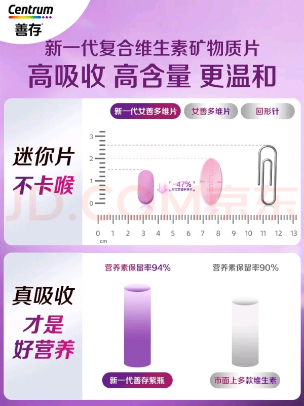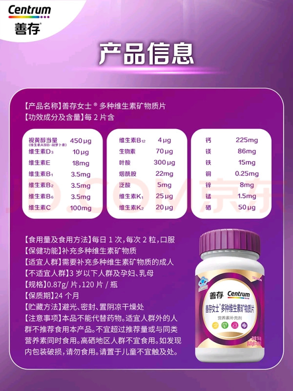 善存复合维生素b族烟酰胺b12维dvce叶酸vk2铁硒女士紫瓶120粒 高含量小颗粒女士多维