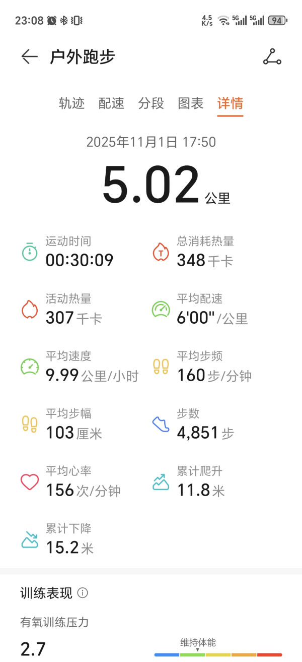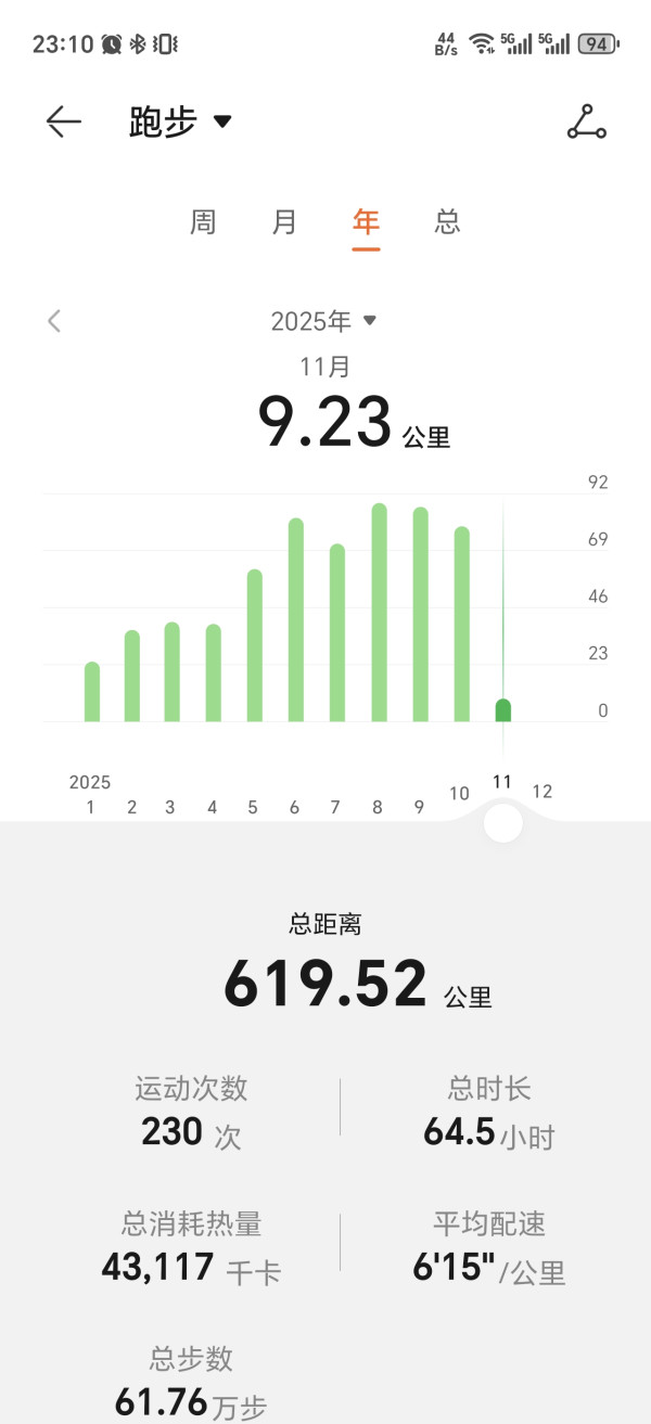 我是去年9月开始跑步的,到现在已经坚持了1年多的时间,今年累计跑了600多公里,基本上每个月坚持在70到90公里左右,个人感觉这个跑量还行,挺适合我自己的。 刚开始跑的小伙伴想买跑步装备的话,建议先买双鞋子和手表,鞋子选缓震的,对膝盖会有一定的保护作用,手表我用的是GT5,数据还算准,就是后壳容易刮花,这个要注意。 然后跑步前一定要热身,热身时间我觉得5分钟就可以了,跟着手表教程来。跑完之后要做拉伸,这样对腿会更友好,夏天的话记得补水和降低配速、跑量,适合自己的才是更好的。 一年多下来之后,给我最大的一个体会就是,跑步带来的不仅仅是身体素质的提升,更多的是精神状态、工作效率、日常心态上的改变,大家可以坚持跑跑试试看。#跑步的人最酷 #跑步装备党 #跑步的正确打开方式 #跑步人生 #跑步爱好者社区