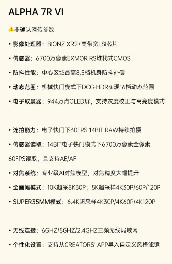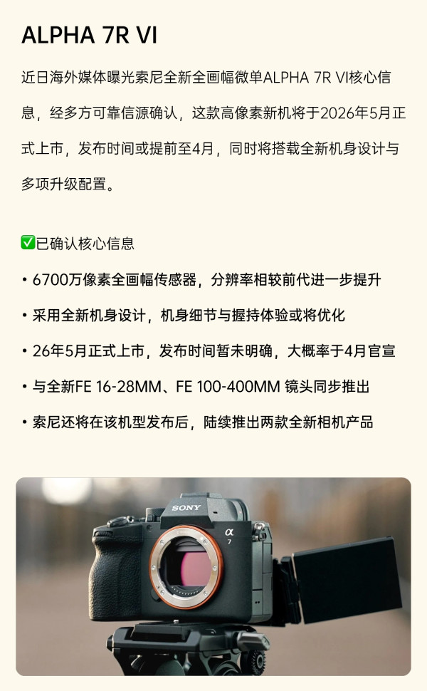 索尼A7R6爆料🔥6700万像素+5月上市!R5不香了 数码摄影党狂喜!海外权威摄影媒体+多方可靠信源实锤索尼全画幅微单A7R VI要来啦,4月大概率官宣,5月正式上市✨ ✅已确认核心信息(必看)▪️6700万像素全画幅传感器,直接碾压上一代R5的6100万▪️全新机身设计,握持手感大优化,长时间拍摄更舒服▪️同步上新两款GM镜头:FE 16-28mm f/2.0 GM、FE 100-400mm f/4.0 GM▪️发布后还会陆续推出两款全新相机,索尼这是要放大招 ⚠️网传高能参数(仅供参考,直接封神)▪️处理器:BIONZ XR2+高带宽LSI芯片,处理速度拉满▪️防抖:中心区域最高8.5档机身防抖,手持拍也超稳▪️动态范围:机械快门DCG-HDR实现16档,暗光环境直接封神▪️取景器:944万点OLED,高亮度+灰度校正,取景超清晰▪️连拍:电子快门30fps 14bit RAW持续拍,抓拍毫不费力▪️视频:全画幅10K超采样8K30p,4K120p慢动作随便拍▪️AI对焦:专业级模型,对焦精度大幅提升,人像/动物对焦更准▪️无线:6GHz/5GHz/2.4GHz三频WiFi,传图超快不卡顿 看完直接坐不住!高像素+超强视频+全能性能摄影人、风光党、视频博主都可以蹲一波手里的A7R5瞬间不香了😭 #索尼A7R6 #索尼相机#索尼A7R6震撼来袭