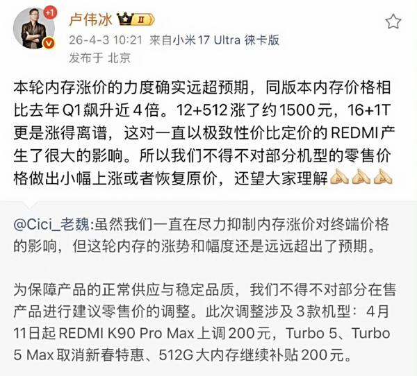 家人们谁懂啊!刚刷到卢伟冰的发文,直接被这波内存涨价惊到了😭同版本内存价格相比去年Q1直接飙涨近4倍,12+512光成本就涨了约1500元,16+1T更是涨得离谱!这真不是厂商割韭菜,是整个行业被AI逼到墙角了! 一、内存疯涨4倍,背后真相太扎心 以前总觉得手机内存便宜是天经地义,几百块就能上大存储,现在才发现,这波涨价完全是AI浪潮下的必然结果。AI大模型爆发,AI服务器成了“吞存储怪兽”,三星、美光这些存储大厂,直接把七八成产能转去做HBM高带宽内存。一台AI服务器吞掉的存储量,能顶几十上百台手机,手机存储产能被严重挤兑,价格直接坐火箭式飙升。Counterpoint的数据更直观:DRAM和NAND闪存价格,2026年Q1相比2025年Q4直接翻倍,部分型号涨幅超150%,手机存储成本暴涨,厂商根本扛不住。 二、小米扛了最久,只微调Redmi少数机型 卢伟冰在文中明确表示,这轮内存涨价力度远超预期,对一直走极致性价比路线的Redmi影响巨大,不得不对部分机型零售价做小幅上调或恢复原价。具体调整为:4月11日起,REDMI K90 Pro Max上调200元,Turbo 5、Turbo 5 Max取消新春特惠,同时512G大内存继续补贴200元。能看出来,小米已经扛了很久,只微调了少数机型,涨幅也是行业里最小的,还保留了大内存补贴,真的是在尽力给用户让利了。 三、千元机大内存时代,真的要结束了 这波涨价,对我们普通用户来说,最直观的影响就是:千元机大内存时代彻底结束了。以前几百块就能从128G升级到512G,甚至1T,以后这种好事只会越来越少。未来手机市场,大概率会变成“低配更贵、高配天价”,大存储不再是性价比标配,而是高端机型的专属。更现实的是,业内预测这波涨势至少会持续到2027年底,刚需换机的朋友,别再等“大降价”了,早买早享受,越等只会越贵。 四、这不是寒冬,是我们为AI买单 很多人吐槽手机涨价,觉得是厂商割韭菜,但其实这不是手机行业的寒冬,而是AI浪潮下,我们每个人都在为科技的进步买单。AI的发展需要海量的存储算力,存储产能向AI服务器倾斜,是行业发展的必然。手机作为消费电子的终端,自然会受到波及,涨价只是时间问题。对于厂商来说,不是不想维持低价,是成本真的扛不住;对于用户来说,只能慢慢接受这个现实,适应“大存储更贵”的市场环境。 最后想说,这波内存涨价,真的是行业无奈,不是厂商割韭菜。刚需换机的朋友,别再观望了,趁现在涨幅还没到顶,该入手就入手;等等党也别再等降价了,这波涨势只会越来越高。 你最近有换机计划吗?会因为内存涨价提前入手,还是继续观望?评论区聊聊你的看法~ #内存涨价 #卢伟冰 #小米 #Redmi #数码资讯 #科技数码 #芯片 #AI #手机涨价 #数码新鲜事#数码好物种草团