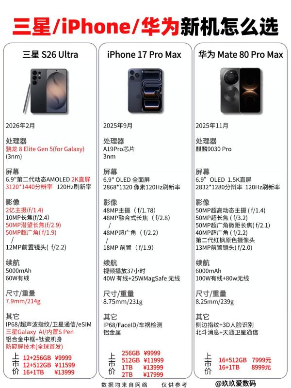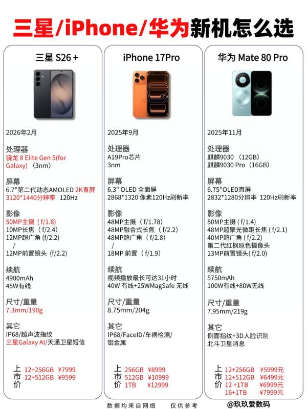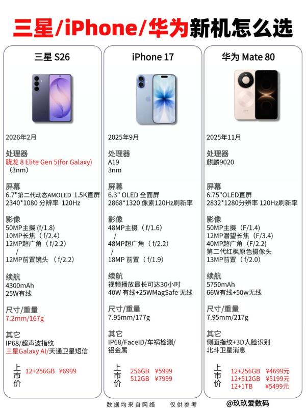 2026年手机旗舰圈彻底卷起来了!三星、苹果、华为三大阵营新机全部登场,很多宝子挑花眼不知道咋选,今天把核心差异全捋清楚,看完直接锁定适合自己的那款,不花冤枉钱! 📱 屏幕&手感|直观体验直接拉开差距 三星S26系列 全系标配第二代动态AMOLED直屏,画质、护眼双在线,色彩还原度直接拉满,看剧、刷视频视觉感超绝。基础版S26直接做到167g轻薄机身,拿在手里轻飘飘的,单手操作毫无压力,长时间刷手机也不压手;Ultra版本更是自带防窥屏,亮度拉满的同时,隐私保护直接拉满,通勤路上玩手机再也不怕被旁人偷看,兼顾视觉与实用性。 iPhone17系列 依旧是超瓷晶面板,抗摔耐造性没得说,日常小磕小碰完全不用慌,屏幕素质稳定,但整体手感偏厚重,小屏党上手会觉得有分量。 华为Mate80系列 全系采用直屏设计,屏幕观感舒适,贴合日常使用习惯,机身因为搭载大电池,手感偏扎实,拿在手里很有质感,续航和手感做到了平衡。 ⚡ 性能&AI|全能实力谁更能打 三星S26系列 全系搭载骁龙8 Elite Gen5定制版芯片,专为三星机型优化,性能释放超稳定,不管是大型3A游戏高画质运行,还是多APP后台切换,都丝滑不卡顿,完全没有发热掉帧的烦恼。更绝的是Galaxy AI全域覆盖,实时翻译、文档一键摘要、智能修图、通话录音实时转文字,日常办公、出国旅行、拍照修图全搞定,实用性直接拉满,懒人福音! iPhone17系列 A19芯片加持,iOS系统的流畅度依旧是天花板,用个三四年都不卡顿,游戏性能强劲,操作丝滑。但快充依旧保守,综合体验偏内敛,没有太多花里胡哨的功能,胜在稳定。 华为Mate80系列 麒麟芯片+鸿蒙系统王炸组合,运行流畅不卡顿,多设备协同能力无人能敌,手机、平板、电脑无缝流转,办公效率翻倍,通信能力更是核心优势,信号稳定性拉满。 📸 影像&续航|日常需求全满足 三星S26系列 S26 Ultra直接封神,超清夜间视频+Log视频创作功能拉满,夜拍毫无压力,暗处细节清晰不模糊,拍视频、拍夜景随手出大片;还搭载60W快充,续航焦虑彻底拜拜,充电速度飞快,碎片化时间就能充满电,出门不用带充电宝。 iPhone17系列 视频拍摄实力依旧能打,色彩还原真实自然,vlog博主、喜欢拍视频的宝子会很爱,但只有Pro系列支持全焦段拍摄,基础版影像配置稍弱。 华为Mate80系列 主打红枫原色影像,色彩调校很有特色,长焦夜景表现尤为出色,拍远景、拍夜景氛围感拉满,适合喜欢拍风景、日常随拍的宝子。 ✨ 三星中端黑马|A57亮点拉满 2026三星唯一中端机A57真的太香了!6.9mm纤薄机身,比同价位机型薄太多,还轻了19g,拿在手里轻薄无负担;金属边框+玻璃背板,质感完全不输旗舰,三摄+算力升级,夜拍、变焦表现远超同价位;5000mAh大电池+45W快充,续航够用还充电快,超慧智能支持即圈即搜、表情替换,还有6年系统升级+安全更新,隐私保护到位,用个五六年都不落后,中端机闭眼入不亏! 💡 一句话选机指南 ✅ 想要顶级屏幕、轻薄手感、全能AI、影像续航无短板→冲三星S26全系✅ 小屏轻薄党→S26;大屏均衡党→S26+;顶配影像+隐私防护→S26 Ultra✅ 中端机性价比之选→三星A57,轻薄好用还耐用✅ 执念iOS生态、主打视频拍摄→iPhone17 Pro系列✅ 鸿蒙全家桶用户、看重通信与多设备协同→Mate80 Pro/Pro Max 而且三星S26系列配色超全,黑白紫蓝都有,专属色号很难抢,喜欢白色、紫色的宝子一定要抓紧机会! #三星 #三星S26 #三星S26ultra #三星A57 #数码新品 #手机推荐 #防窥屏 #数码大玩家 #手机测评 三大旗舰里你最心仪哪一款?会冲三星旗舰还是坚守苹果、华为呀?#手机评测团