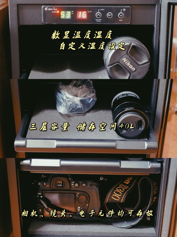 自打买了个新相机和镜头,家里最原始的那种防潮箱就逐渐不够用了最老的就是一个这种说实话,我觉得这玩意是聊胜于无,应该是没太大用处因为家里电子产品也没那么多,所以就买了一个不太大的一共三层,然后里面有自己的照明led灯大概用了半年多吧,显示的湿度就从来都没变过,问了下客服,客服回应也很迅速,让我把后面带风扇的抽湿器给寄回去,很快就换了一个这种售后的态度算是非常棒了一共是三层,其实也算是容量比较大了,相机,镜头,一些平时攒下来的纪念币纪念章什么的,足够放了梅雨季节有时候家里地板都冒水,但是这个防潮箱里面就还好…