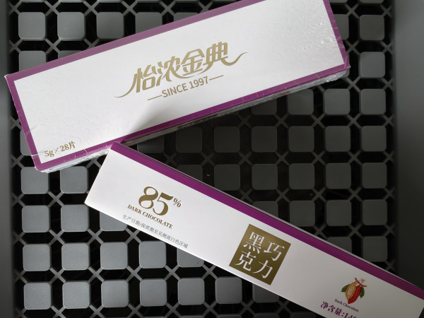 #达人激励计划 之前买了怡浓金典巧克力,发现还真挺不错,价格便宜,纯可可脂,浓度可选,味道很纯正,尤其是100%黑巧克力,不酸不涩,微苦的可可味。这次我又回购了85%黑巧克力,还送了两盒64%含量的黑巧克力。85%含量的略微带一点甜,相比之前的100%,口感松散一点,不算特别苦,可可味还是挺浓的,64%的就甜味居多了,和市面上普通巧克力的甜味差不太大。我个人还是更喜欢纯一点的黑巧克力,吃过很多进口巧克力,怡浓这款性价比远远超出,喜欢黑巧克力的朋友绝对不能错过。