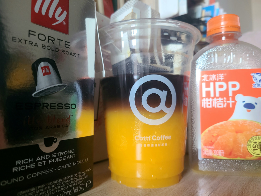 最近淘宝闪购的红包都缩水了库迪的西西里美式从1.9↗️3.9↗️5.9虽然性价比还在,但下单欲望减退了毕竟平时点美式&生椰这款不另外加糖,还是有点过于齁甜自己动手复刻,直接来真低糖版本🍹原料☕️illy特深烘焙浓缩咖啡咖啡没啥要求,毕竟都是苦的,任选就行🧃北冰洋HPP柑桔汁理想中的西西里=先酸、后苦、再甜,这款柑桔汁就挺符合我口味的;直接用西柚+橙汁也行🫖步骤冰块(水):咖啡:果汁=1:3:6果汁打底,后加咖啡,有冰更佳n