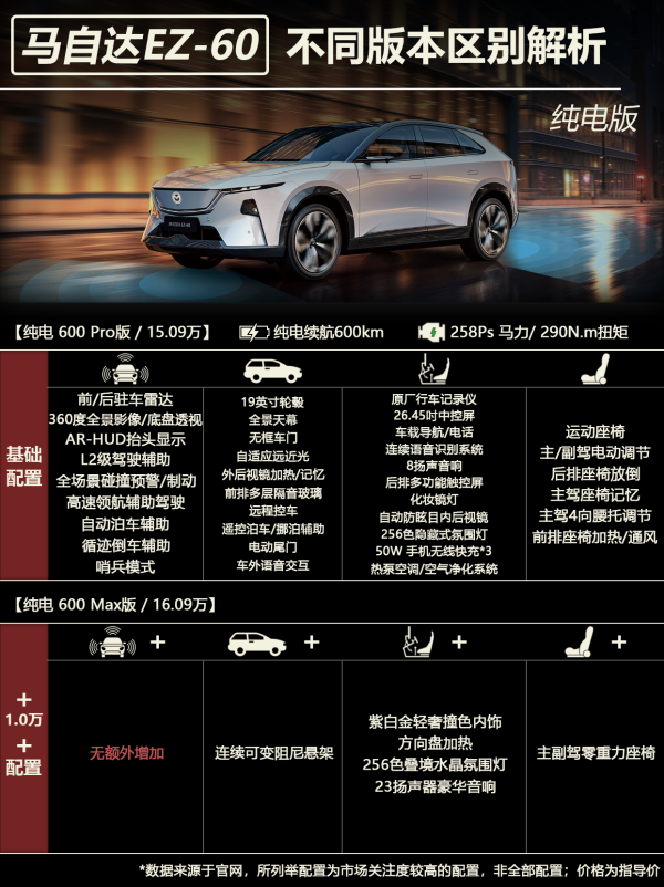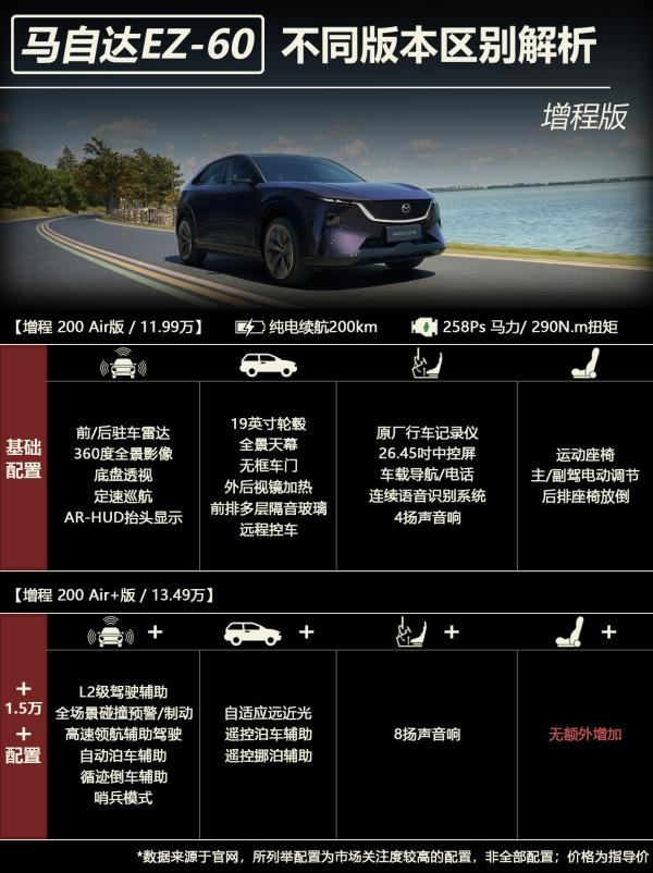 每天看一个车型的不同版本区别解析和选择策略,今天是马自达EZ-60。电池方面增程版 采用磷酸铁锂电池 31.73kWh容量 30-80%快充期间15分钟纯电版 采用磷酸铁锂电池 77.94kWh容量 30-80%快充期间15分钟选购策略我觉得这台车主打的还是增程版本,因为确实纯电版的价格市场上有不少可以选择的车。那么增程版,如果是老司机,个人推荐入门版,没有高阶的驾驶辅助,就是配上了常用的540度影像等。如果在乎高速领航驾驶辅助,那就直接顶配(预算充足情况下),因为次入门版总感觉仅仅加了驾驶辅助,又会眼馋次顶配的座舱配置(手机无线充电、前排座椅加热通风等),但是次顶配肯定又眼馋顶配的可变阻尼悬架,所以还不如直接顶配,不留遗憾那种。以上还是偏个人主观的建议,同学们如果有更好的看法欢迎一起补充,如果想看别的车型的同学也欢迎一起交流。#马自达EZ60