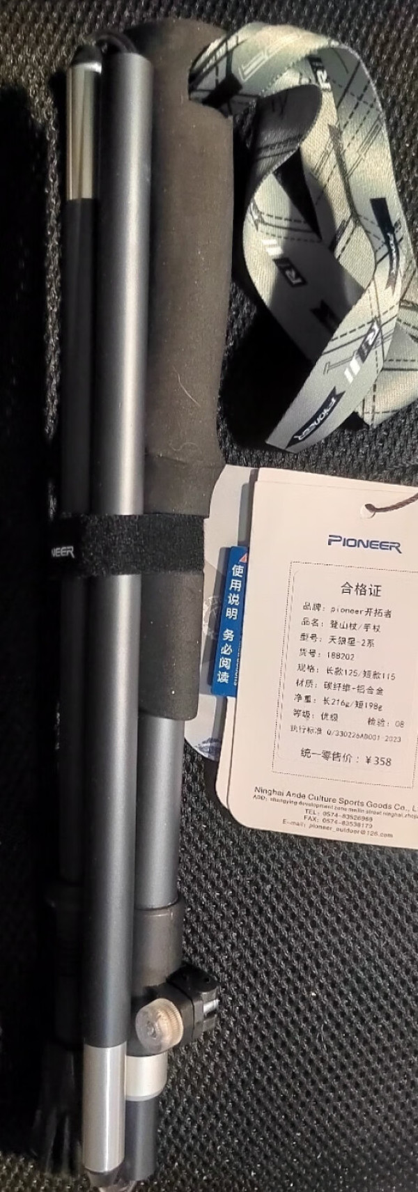 #每一步都算数 最近入手了开拓者(Pioneer)天狼星 - 2 系登山杖,开箱体验令人惊喜,特此分享。 一、品牌与包装 包装盒上醒目的 “Pioneer” 标识,传递出专业户外装备的质感。打开包装,登山杖、合格证、使用说明及配件一应俱全。合格证详细标注:品牌 “pioneer 开拓者”,品名 “登山杖 / 手杖”,型号 “天狼星 - 2 系”,材质为碳纤维与铝合金,长杖重 216g,短杖 198g,统一零售价 358 元,执行标准清晰,品质有保障。 二、外观与设计 登山杖主体设计简约大方,手柄符合人体工程学,握感舒适,长时间使用不易疲劳。腕带印有品牌标识,材质柔软且可调节,确保登山杖稳固不脱落。配有黑色收纳袋与网状便携袋,方便携带与存放。 三、配件与细节 随杖附赠折叠拉伸使用步骤说明,操作一目了然:打开外锁、抽拉第二节、抽拉第三节至弹出、关闭外锁,轻松完成伸展。配件包内有替换杖尖套,可适应不同地形,细节之处尽显贴心。 四、使用体验 碳纤维与铝合金材质兼顾轻便与坚固,伸缩结构稳定,外锁设计确保调节后不松动。无论是登山还是徒步,都能提供有力支撑,减轻腿部负担,增强行走稳定性。 开拓者登山杖,以专业设计、优质材质与贴心配件,成为户外探险的可靠伙伴,助力每一次前行。