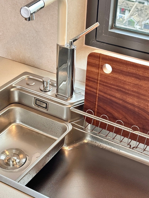 #值友的万家灯火 选水槽熬了好几个大夜,对比了无数款,最后直接被大单槽拿捏!收到货真的惊艳到我,这波完全没踩雷~304不锈钢的雨滴压纹,摸起来细腻又耐造,再也不怕锅碗瓢盆刮花台面。深槽设计太香了,大汤锅、烤盘直接丢进去洗,再也不用像以前双槽那样“辗转腾挪”。淘了几周才选出来的奶白+铬色水龙头也超戳我,颜值和质感双在线(安水龙头的师傅说我这水龙头质量媲美国际大牌,心里美滋滋),出水流畅还能灵活转向,冲洗水槽边角毫无死角。底部带坡度排水也唰唰的,不积水不藏垢,孔位都在左边,右边空间超大,洗东西超方便。配件精简实用:沥水篮、盆中盆、菜板,一套搞定洗菜切配,厨房效率直接拉满。用了才知道,好水槽真的提升下厨幸福感!正在选水槽的姐妹,闭眼冲不亏~