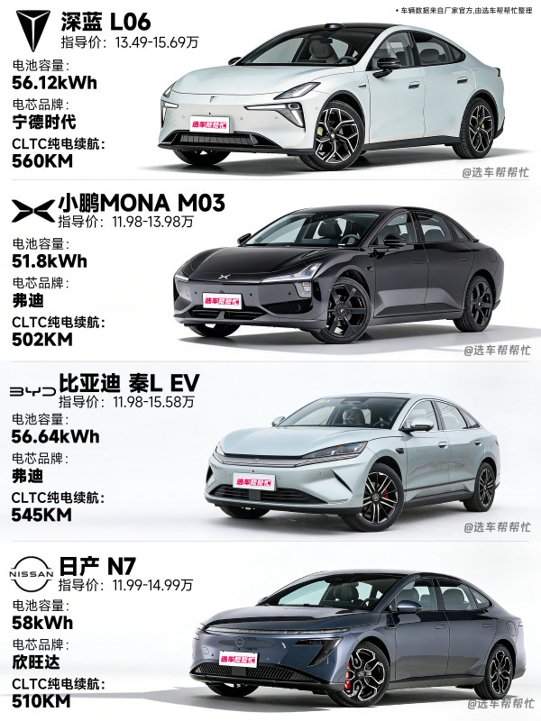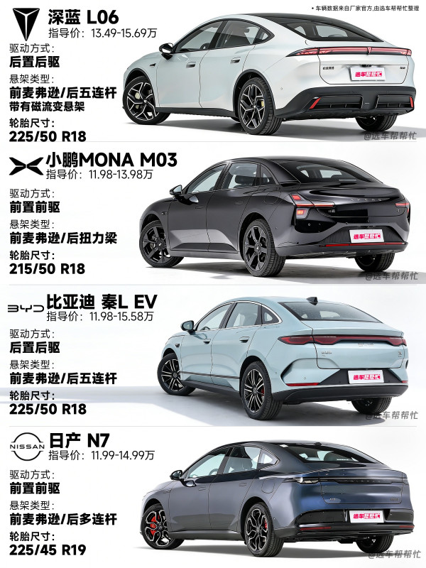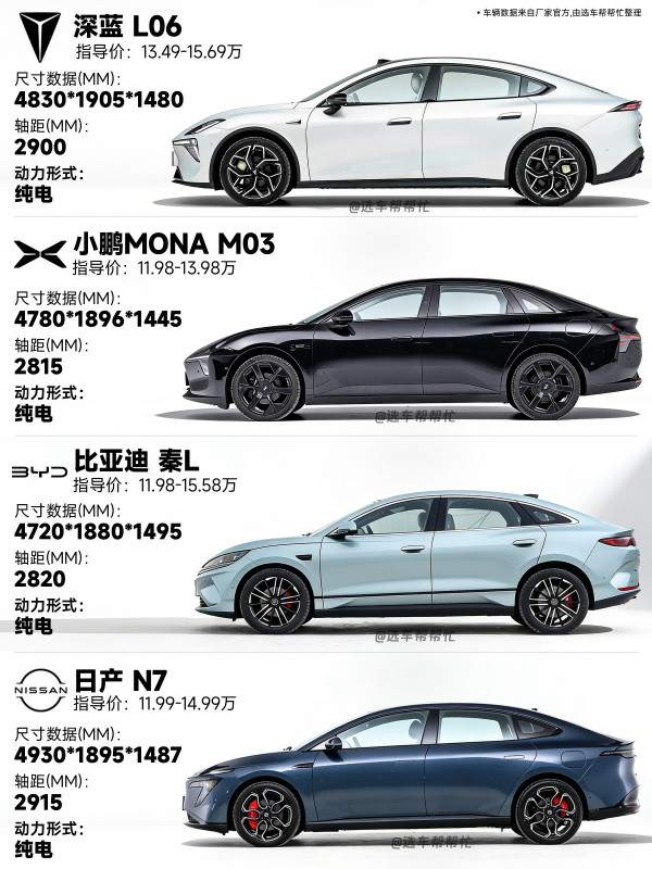 13万左右是很多朋友在第一次考虑新能源车🚗的时候,会考虑到的价位段。这价位的纯电轿车都希望产品力均衡、驾驶感受好,辅助驾驶表现也是今年很多朋友在乎的,这次就来聊聊这个价位,我觉得可以考虑的几款纯电轿车 🌟我建议对比的4款车是1️⃣深蓝L062️⃣小鹏MONA M033️⃣比亚迪 秦L EV4️⃣日产 N7 🌈尺寸方面(图1)🌈动力方面(图2、4、5)🌈辅助驾驶配置(图3) 🌈配置方面:4款车标配:主副驾安全气囊、侧气囊、头部气帘、后雷达、车道偏离预警、主动刹车、全景影像、前后雷达、自适应巡航、并线辅助、高速辅助驾驶、无线充电、对外放电、感应雨刷、前排座椅加热/通风、氛围灯 🚗L06多配备:激光雷达、城区辅助驾驶、无框车门、电尾门、50英寸HUD、热泵空调🚗M03多配备:城区辅助驾驶、电尾门、方向盘加热、驾驶位座椅按摩🚗秦L EV多配备: 12英寸HUD、热泵空调、车载冰箱🚗N7多配备:城区辅助驾驶、电尾门、Carplay、前排座椅按摩 🌟L06零百加速 5.9 秒,动力输出稳定,CLTC 纯电续航560km、标配宁德时代电芯,金钟罩电池系统安全性也扎实。智驾体验上,过弯时车身控制精准,弯道行驶平稳,决策果断且动作连贯,加减速调校无明显顿挫感,在这个价位表现很不错。如果想要考虑一个各方面都均衡的车可以考虑🌟M03辅助驾驶的能力同价位表现也不错,它没有使用激光雷达采用全视觉方案,能能够应对常规城市道路,为日常驾驶提供一定便利,在简单路况下的辅助表现贴合其产品定位。🌟秦L EV是高速辅助驾驶,CLTC纯电续航545KM。作为比亚迪的纯电车型,总体的销量还可以,如果是考虑比亚迪的车也比较空间,可以看看它🌟N7采用Momenta辅助驾驶方案,表现能够达到主流的水准。使用欣旺达电池,CLTC续航 510KM,空间、配置表现还是不错的。如果说是想选一个合资品牌的纯电车,可以考虑它🌈各位在这个价位有哪些车觉得不错呢,欢迎来聊聊#达人激励计划 #新能源车选购指南 #值友说车 #新车速递