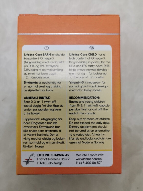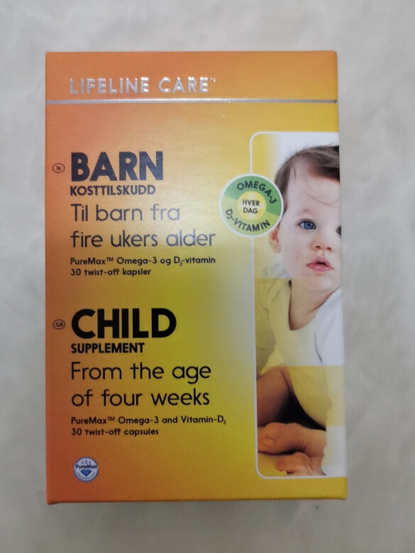 宝贝的健康成长是很多麻麻担心的,在挑鱼油的时候都各种对比,怕有些不好,还有我堂姐是儿科医生,比较懂,给我介绍了Lifeline Care婴幼儿鱼油DHA~这款是挪威本土婴幼儿畅销产品,儿科医生都在推荐,更加值得妈妈们的信赖了~每粒含317mg高含量DHA,每天只需一粒,促进宝宝大脑和眼部发育! 4001U 维生素D3,促进钙吸收,让宝宝骨骼更强壮!天然提取的柠檬香使得鱼油的口感更好,宝宝也更爱吃!因为有的鱼油有很浓的鱼腥味,宝宝闻了可能不爱!品质方面也很有保障,挪威地理位置靠近北极生态环境好,污染少,它家鱼油符合国际鱼油标准欧盟认证,是高质量高纯净高的鱼油~包装方面是挺大气的感觉,我给我宝宝吃是直接拧开挤进去的呢