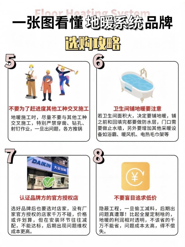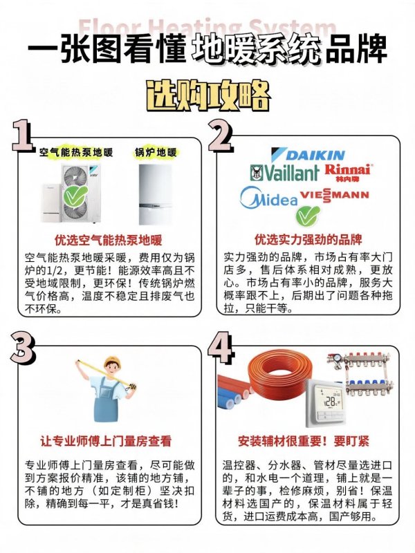 家用地暖品牌怎么选?不要被忽悠不要上当经常有朋友问地暖应该选哪个品牌?嘿嘿,我敢打赌90%的人都没有搞清楚那我们今天就来说一说地暖要怎么选?1⃣️热源热源像人体的心脏,源源不断地为地暖提供热水的设备。稳定性、耐用、节能是最重要的指标,最常见的是燃气壁挂炉。不仅能提供采暖,还能提供生活热水,如果你有壁挂炉,就不需要买热水器了。壁挂炉的品牌比较多,进口的有德国菲斯曼、威能、博世、阿里斯顿、史密斯、八喜等,国产的有万和、小松鼠、小沃、美的、海尔等。目前的壁挂炉市场,德系品牌处于绝对领先地位,大家也愿意相信德系品牌的品质2⃣️管道管道负责把热水输送到每一个房间里去加热地面,最基本的要求就是不漏水,不易结垢。目前主流的地暖管有pert管、pex管、铝塑管等。 pex管:耐高温、无毒无味,不易腐蚀不阻碍水流。追求性价比的用pert管,pert就是改良后的聚乙烯,长期耐受温度为60°℃,具有无毒、柔软、抗老化等优点,是南方采暖最适合、性价比最高的地暖管道。进口管道的有瑞好、乔治费歇尔、欧博诺,国产有保利、伟星、中财、日丰、欧瑞能等。都是质保50年,大家根据预算自由选择。3⃣️保温保温系统是由保温板、反射膜、边界保温条、伸缩缝等基础材料构成,它们要保证热量不损失,保温将直接决定后期采暖费用。保温材料产品本身价格不高,但是运费。成本非常高,所以基本是没有进口产品的。那么如何选择判断呢?首先量厚度,保温板厚度>3cm,厚度太薄起不到保温的效果,其次看硬度,用手按压保温板,如果一按一个坑,那这种肯定不得行4⃣️控制温控系统可以把房间调成我们想要的温度,好的温控系统不仅能保持舒适宜人的温度,还能降低地暖的能耗。温控器品牌有森威尔、曼瑞德、柯耐弗,都是很不错的。5⃣️辅材市面上小作坊辅材可就太多了,教大家鉴别小作坊不知名辅材的方法,简单粗暴好用,只要看到报价单上面没有标注具体辅材品牌的且只写了“定制”的,有一个算一个全是杂牌辅材,一定不要用。小白不会选的一律推荐绿羽辅材或者诺尔,蓝枫一定选用白晶板,至少有保障。6⃣️安装很多人后期地面开裂,或者是效果不好都更安装细节有很大关系,首选,边界保温条,伸缩缝,硅晶网是一定要有,且要做到位,细节不到位后期迟早要出问题。7⃣️回填现在回填的方式有很多,米石回填,豆石等等。要想要效果好节能,首选豆石加混凝土回填,此回填的蓄热性能,导热性是其他材料无法替代的。如有地暖任何问题,欢迎留言讨论~