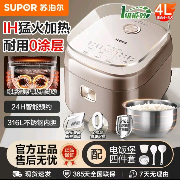 详细对比四款市面热门的电饭煲,均为4L容量,覆盖不同价位和需求。 美的 MB-G5 (花瓣IH) 定位高端,主打极致口感与健康安全。它采用专利花瓣IH底部加热+上盖赤炎板双热源,配合20kPa智能微压技术,能实现米粒360°翻滚沸腾,煮出的米饭蓬松Q弹。内胆为99.9%生物级纯钛(实际为304不锈钢镀钛),是0涂层的高端选择。支持智能米种识别和24小时预约,适合预算充足、追求最佳米饭口感的家庭。参考价约 ¥400-1000。苏泊尔 SF40HC4896 主打高性价比的0涂层选择。核心是1300W IH电磁加热,配合316L不锈钢内胆,安全耐用且避免了涂层脱落的隐患。支持7段火力智能控制、大微压破泡技术和24小时预约,还有柴火饭、快速饭等10大功能菜单。4L容量适合3-4口之家,在200元价位极具竞争力。松下 HNS151 (饭光光) 日系精工代表,以技术和细节取胜。采用两段IH变频加热和独特的90度角釜内胆,底部配备风冷防粘技术,能有效解决不锈钢内胆粘锅问题。内胆为0涂层304不锈钢,支持AI米量判定和多达14种日式料理程序,还可直接放入洗碗机清洗,非常方便。适合信赖日系品牌、注重功能多样性和日常打理便捷性的用户。参考价约 ¥4000。东芝 RC-15HOVC (白珍珠) 兼顾日系体验与中端预算。搭载1300W IH立体加热+上盖加热,配合60°球底圆釜内胆,确保米粒均匀受热。内胆同样是安全的316L不锈钢0涂层,并且有特色的高温循环沥糖技术,适合有控糖需求的家庭。支持快速、发芽、低糖等多种米饭模式和24小时预约,想体验日系口感又不想花高价的用户可以重点考虑。参考价约 ¥800-900。选购建议 - 预算有限、追求安全:选苏泊尔 SF40HC4896。- 想体验日系、看重功能:选东芝 RC-15HOVC。- 信赖日系精工、注重细节:选松下 HNS151。- 追求极致口感、预算充足:选美的 MB-G5。#放心消费科普大赛