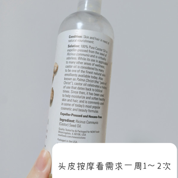 #护肤美妆抄底季 NOW以前海淘时候常买他家的东西,皮肤护理产品比起保健品使用感来说更喜欢,平价好用,东西买了就要用,不然坏了就浪费了 家里还有个旧瓶子Aura cacia的,也是蓖麻油,不一样的就是有机会贵很多。感觉没必要买这么贵了就买了诺奥(目前国内可以买翻译的名字)便宜很多,之前贪心买了一桶大的蓖麻油到现在还没用完,因为买来生发护理用的也不敢用身上。有条件就在休息时候做头皮按摩,感觉头发会粗一点。 因为我一直都是沙发发质很容易炸毛,目前是偶尔用蓖麻油按摩头皮,这次双十一活动天猫国际打折买了雪松打算混合用来缓解头屑和脱发问题,头皮也是皮,也需要健康护理的 蓖麻油配比大家可以问问豆包,或者搜索一下芳疗配方,我是随意配的。也可以买迷迭香搭配会更好。使用办法: ①首先蓖麻油混合配方滴在发缝位置!把头顶和两侧头发全部粘上蓖麻油,发尾只需手上残留油脂带一下,不需要涂满。 ②然后开始用指腹按摩头皮。时间长一点最好,一般我可能偷懒十几分钟,认真会按摩半小时,停留在头发上30分钟以上。③最后再使用护发素或者滋润型洗发水洗掉。如果擦太多需要护发素帮忙多洗几遍,擦习惯了知道控制量,用洗发水就行。♥洗完吹干以后会发现沙发也柔顺很多,对头皮健康也很好。