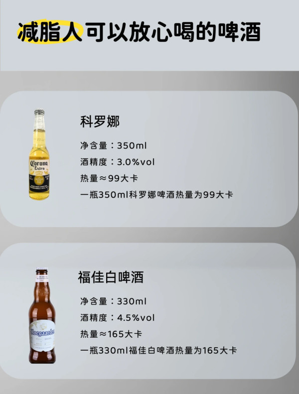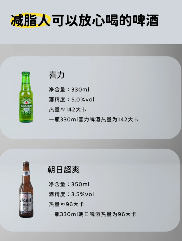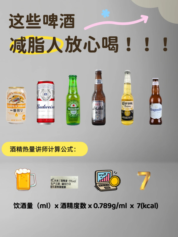 #潜力作者激励计划 #夏日啤酒新选择 #低卡啤酒推荐 #减脂党喝酒指南 冰爽啤酒配烧烤,大概是夏天最惬意的打开方式了。但看着体重秤上的数字,不少减脂党只能望酒兴叹。其实,选对啤酒、喝对方法,减脂期也能放心享受这份快乐~先教你一招算热量:啤酒热量(kcal)= 饮酒量(ml) × 酒精度数 × 5.6。记不住也没关系,看看这些常见款的热量参考:350ml的科罗娜约99大卡,330ml的百威约110大卡,350ml的朝日超爽约96大卡,这些都算减脂期相对友好的选择;而330ml的福佳白约165大卡,350ml的麒麟一番榨约161大卡,喝的时候可以稍微控制量。按种类来看,每500ml淡色拉格约150大卡,差不多一个苹果的热量,是减脂党的首选;小麦啤酒约180大卡,偶尔喝喝没压力;但IPA精酿和黑啤热量较高,分别约210大卡和250大卡,可得浅尝辄止。想喝得无负担,这几个黄金法则得记牢:单次最多喝2罐(660ml),不然之前的运动可能就白练了;下酒菜选毛豆、烤鱼这类高蛋白、低油脂的,比花生、烤肉更合适。还要避开这些坑:果味啤酒看着清爽,其实添加糖超多,堪称“液体蛋糕”;啤酒混着可乐、雪碧喝,双倍气泡带来双倍热量,胖得更快;深夜喝酒也不行,睡前代谢慢,热量容易囤成肉。最后分享个隐藏技巧:每喝1杯酒,穿插喝2杯水,既能加速代谢,又能减少饮酒量;选瓶装比扎啤好,瓶口小更容易控制量。不过要提醒的是,酒精代谢时,脂肪燃烧会暂停3-5小时,喝完记得多走两步消耗一下哦~夏天你最爱用啤酒配什么?有哪些低卡下酒菜推荐?评论区来分享你的秘籍吧~
