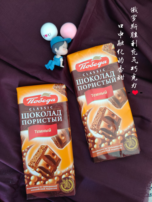 充气巧克力又称为蜂窝状巧克力或气泡巧克力,最喜欢俄罗斯产胜利牌的,另外有牛奶味和奶油味的甜一些,我买的黑巧克力蜂窝,三块的价格在18左右,买一块是65克,充气的缘故,体积大小和100克的差不多。🌿其它品牌也有气泡巧克力。我明明记得国产也有气泡巧克力了,之前收藏的链接没有了,然后去问客服一问三不知……😓🌿因为前几年每年都会买胜利的,所以这次优先买了这款。🌿纯可可脂的哈,不是代可可脂,网上有卖土耳其产价格过分便宜的要当心,毕竟成本在里面。🌿口感,为什么要充气,就是同样大小的巧克力,进入口腔融化的口感不一样。不会黏住你的舌头,那种感觉,你要亲自试一试才能体会到的奇妙。🌸