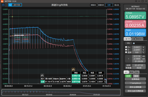 我终究是闲到连无线耳机的充电都测了吗(笑)(其实很久之前就测了,刚翻到素材现在才发)充电器使用联想100W口红电源,测试功率表是维简K2,使用电脑上位机采集图像。最高5V0.6A的输入,充满共用时1小时09分,平均功率2.05W,看了之后我在想我为什么要测耳机的充电,是不是我太闲了(笑)#硬核实测报告 #数码好物种草团 #男人梦想的数码装备 #学生党潮酷电子装备 #晒晒你入手的数码好物