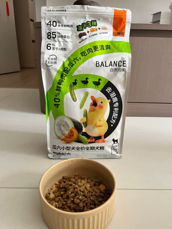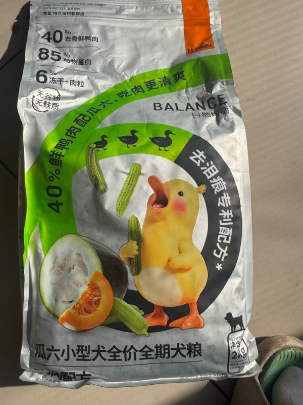#养宠一年小结 比瑞吉瓜六小型犬粮选购笔记:泪痕小狗的“清爽吃肉”选择 最近挖到一款很戳小型犬家长的粮——比瑞吉“瓜六”小型犬全价全期犬粮,整理下核心亮点供参考: - 肉&蛋白够实在主料是40%去骨鲜鸭肉(肉含量直接标在包装上很坦诚),搭配85%动物蛋白,同时是无谷物无麸质配方,对肠胃敏感的小型犬很友好,吃着低敏没负担。- “瓜六”是真的有“瓜”名字里的“瓜六”对应6种天然瓜(黄瓜/苦瓜/丝瓜/冬瓜/南瓜/西葫芦),能帮小狗清解腻;还加了去泪痕专利配方(枸杞+决明子+菊花),家里小狗爱挂泪痕的可以重点看看这个点。- 冻干三拼直接拿捏适口性自带6%的冻干+肉粒组合:冻干鸡肉松(高蛋白低脂)+冻干蛋黄粒(美毛)+慢烘鸭肉粒(清爽护肠),挑食小狗基本很难拒绝,干吃或者拌粮都香。- 适配场景很灵活是小型犬全价全期粮(幼犬、成犬都能吃),净含量2kg,包装用了充氮锁鲜设计,不管是试吃还是给小体型狗狗囤粮都合适。 总结:适合想解决小狗泪痕、追求“高蛋白+低敏+高适口性”的小型犬家长,“瓜+肉+冻干”的组合刚好踩中不少养小型犬的需求~