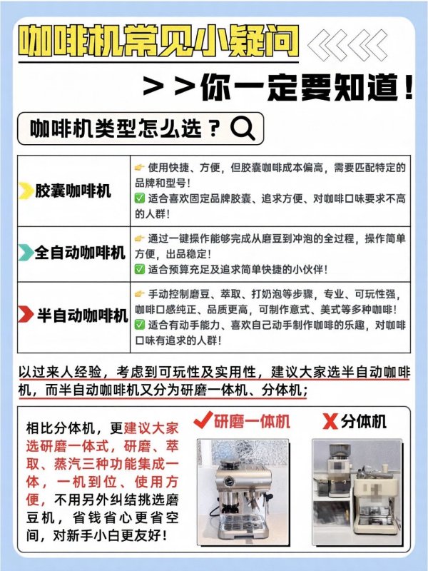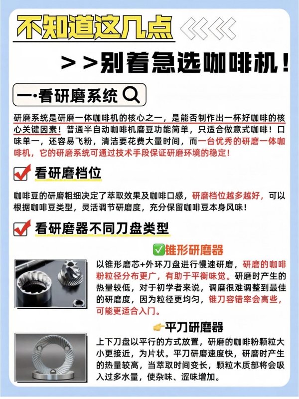 咖啡已成为许多人生活中不可或缺的饮品而拥有一台合适的咖啡机能让您在家随时享受美味咖啡但市面上咖啡机种类丰富,该如何挑选呢?今天就来和大家分享一下咖啡机的选购要点!1⃣️看类型美式咖啡机:操作简单,出品的咖啡口感较清淡;胶囊咖啡机:方便快捷,但胶囊价格高,口味选择局限;全自动咖啡机:一键操作,省心省力,上手快,适合初学者使用。意式咖啡机:能制作出浓郁的意式浓缩咖啡,可搭配奶泡制作拿铁等;半自动咖啡机:需要手动操作,可玩性高,适合有一定咖啡制作经验的人。2⃣️看泵压意式咖啡机的泵压一般在9-15bar较为合适,能更好地萃取咖啡精华。3⃣️看加热方式储热式:可能存在水温波动即热式:加热迅速,水温稳定,萃取质量高4⃣️看研磨功能内置研磨:方便省心,但研磨程度固定;无研磨:需单独配备磨豆机,可根据需求选择不同研磨度5⃣️看容量根据家庭喝咖啡的人数和频率选择合适的水箱容量和豆仓容量6⃣️看附加功能奶泡系统:喜欢喝奶咖的可以关注智能控温:保证咖啡口感自动清洗:节省清洁时间和精力。7⃣️看品牌售后知名品牌质量有保障,售后让人放心。👉选择咖啡豆小技巧1⃣️包装选择不透光的带有单向排气阀的;2⃣️选择手工筛选瑕疵比较少的精品豆,一般的精品豆的瑕疵率在10%~15%;3⃣️注意烘焙日期和最佳赏味期,买豆子时要确定大致饮用时间、喝完时长,看是否符合豆子的赏味期;4⃣️根据自身口味选择合适的烘焙度,咖啡豆烘焙由浅入深,风味从明显的花果香变为碳化后的醇厚感,甚至有明显苦味。👉选购小提示1⃣️考虑咖啡机的尺寸,要与摆放空间匹配。2⃣️选优带有温控系统的,精准控温,把握出品质量。3⃣️优选带有计时功能的,提前定时预约,便捷省时又省力。
