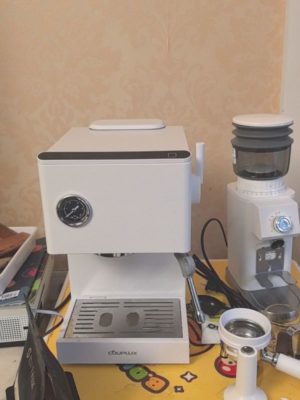 一、功能亮点58毫米标准粉碗(但是双耳手柄和E61手柄不通用,看似一样)串联式双加热块双泵,真的是秒出蒸汽,切换时间什么的不存在二、使用体验到手发现真是小小的一个小白,于是就摆在了闺女的积木玩具桌上,但是这台真的不是玩具机,萃取只要你压粉没问题,压力还是很稳定的,出品效果也OK。整体造型和更高一档的PE3888类似,顶置屏幕缩减为两位数位屏,但确实是什么地方都小小的,水箱也小,打个四五杯再加上放水预热和冲洗就得再装水。接水托盘也小,高度也不够再塞进去电子秤了,大一点的美式咖啡杯就塞不进去,只能放得下标准的意式咖啡杯。蒸汽棒压力没有格米莱猫头鹰那么夸张,相对于新手更好把控一点,45秒打发起来。附送的磨豆机对于家用来说完全足够了,锥刀磨粉精度可以,有静电消除, 不吃粉也不结块,磨豆精度绝不是200块的小飞鹰之类的能碰瓷的。整体来说不到1200就可以有分体式锥刀磨豆机,标准的58毫米粉碗,串联式双泵双加热块,有电子屏,有压力表,除了手柄和e61不通用之外,其他的性能对于家用来说绰绰有余,值得推荐。
