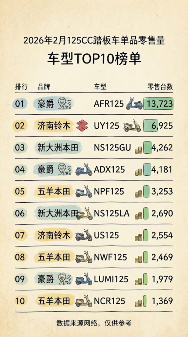 2026年2月125CC踏板车单品销量榜,豪爵AFR125直接拿下第一,卖了13723台,几乎是第二名的两倍。说实话,这个差距有点夸张。济南铃木UY125排第二,6925台,依旧稳得很。第三是新大洲本田NS125GU,4262台。仔细看更有意思:前十里豪爵占3个,五羊本田3个,新大洲本田2个,济南铃木2个。也就是说,这个级别基本还是日系体系和豪爵在“打擂台”。为什么AFR125能卖这么狠?其实答案也简单:省油、稳定、维修便宜,很多人买来就是通勤代步,图的就是一个省心。125踏板这个市场,说到底不是比谁最炫,而是谁最靠谱。能长期霸榜的车,往往都不是最花哨的,但一定是最耐用的。