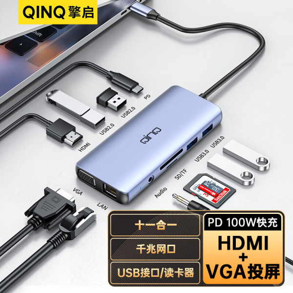 擎启Type-C扩展坞USB-C转HDMI拓展坞VGA转换分线器网口转接头4K通用苹果电脑MacBook Air笔记本ipadpro