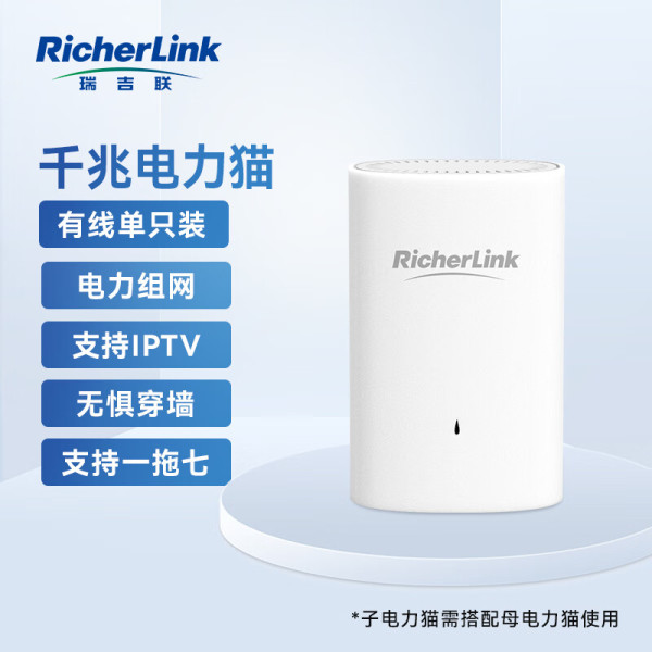 RicherLink瑞吉联R5千兆迷你有线扩展PLC电力猫增强版单只装家用路由器穿墙套装免布线支持IPTV