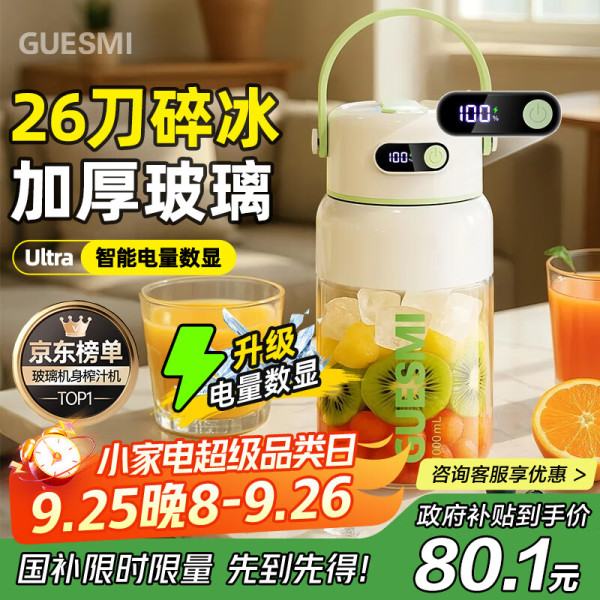 皆米 GUESMI 榨汁杯玻璃电动榨汁机果汁机搅拌杯小型吨吨杯便携家用多功能碎冰果汁杯 GM-Z2503 清新绿 1L