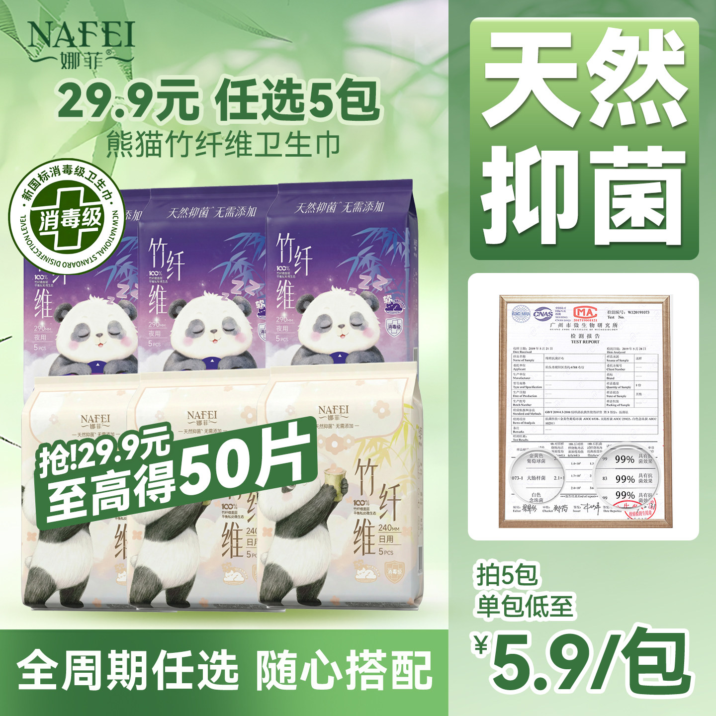 熊猫天然抑菌卫生巾竹纤维消毒级姨妈巾娜菲日夜用敏肌专属超透气