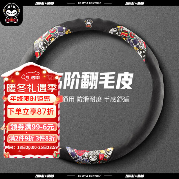 拽猫汽车方向盘套冬季保暖短毛绒翻毛真防滑吸汗汽车把套 1个装