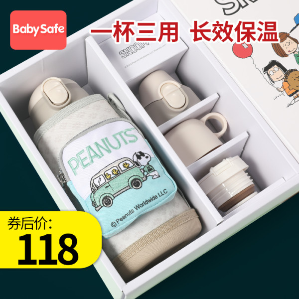 史努比儿童保温杯带吸管三用宝宝婴儿学饮杯幼儿园学生外出喝水壶(红色礼盒套装-600mL-3个杯盖)