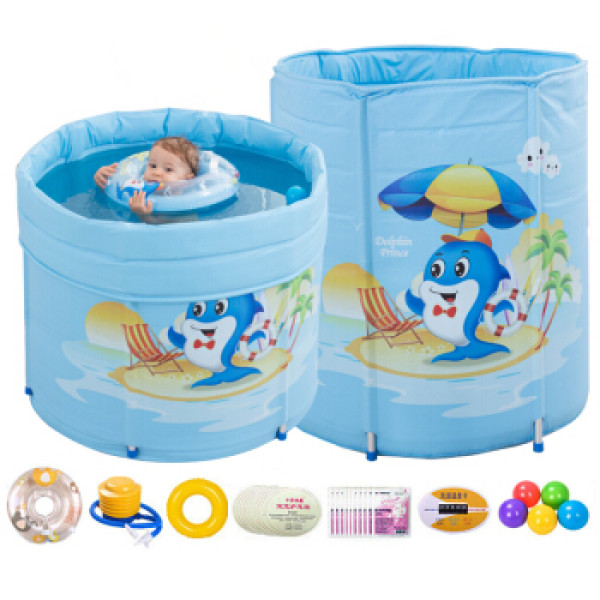 倍护婴 婴儿洗澡盆家庭游泳池浴桶保温合金支架儿童浴盆洗澡桶 蓝色海豚夹棉保温套装