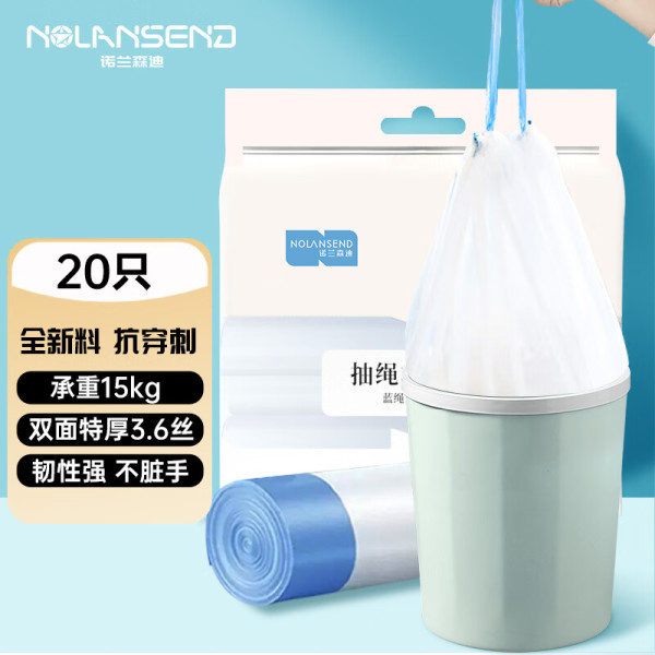 诺兰森迪抽绳垃圾袋单面18μm手提加厚大号双面3.6丝 50*45cm大尺寸垃圾袋 1卷20只