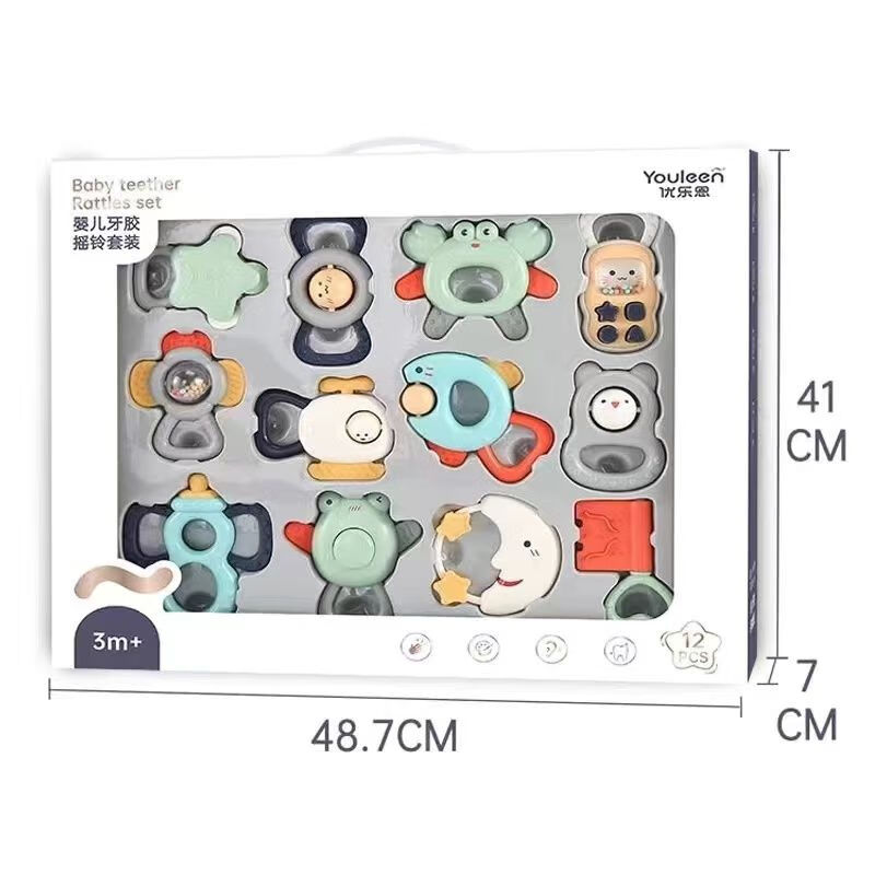 优乐恩摇铃套装牙胶3-12月新生婴儿礼物满月礼玩具萌萌鸡安抚礼盒 【12件牙胶摇铃】礼盒装